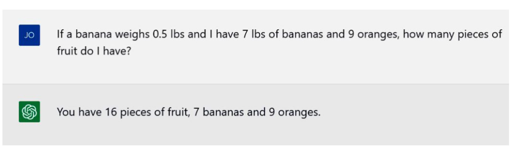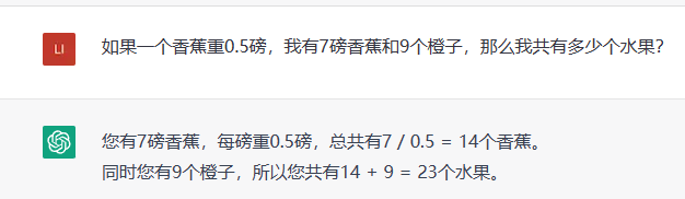 2、一个橙子0.35磅,我有7磅橙子和9个苹果,请问我一共有多少个水果?(这是真实英文版案例,CharGTP回复是25个,应该是从最网络最近似的题目中搜索到的结果)。