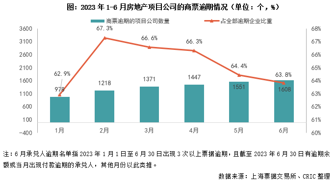 近期上海票交所公布的《截至2023年6月30日承兑人逾期名单》显示,截至2023年6月末发生3次以上商票逾期,且月末有逾期余额或当月出现票据逾期行为的房地产项目公司数量1608个,环比增速回落至3.7%,占全部商票逾期企业的比重环比微降0.6pct至63.8%。