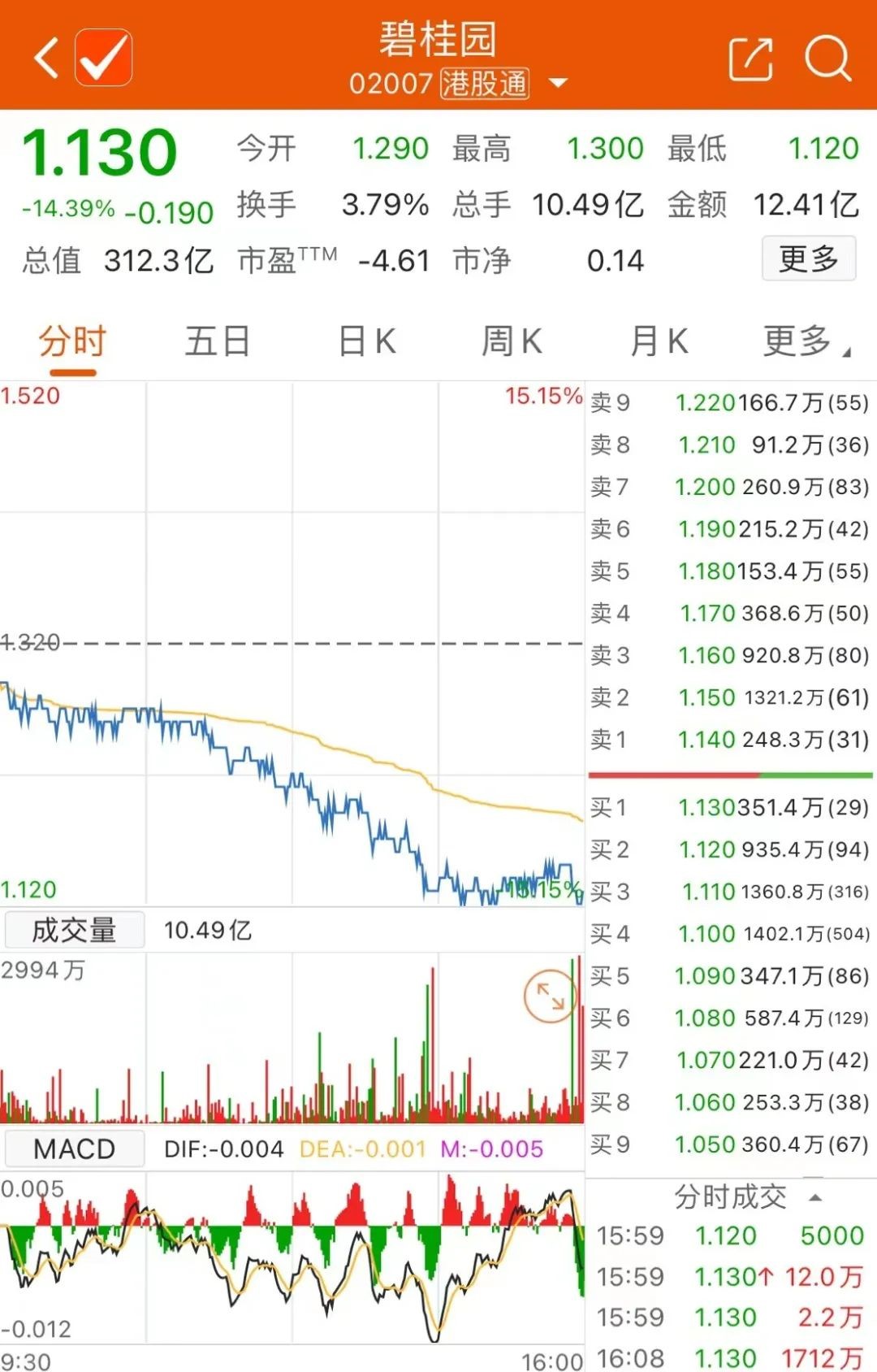 截至8月8日收盘,港股碧桂园跌超14%,报1.130港元/股。