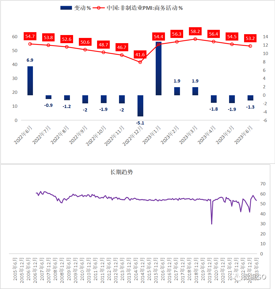 6月份,非制造业商务活动指数为53.2%,比上月下降1.3个百分点,连续3个月下降。