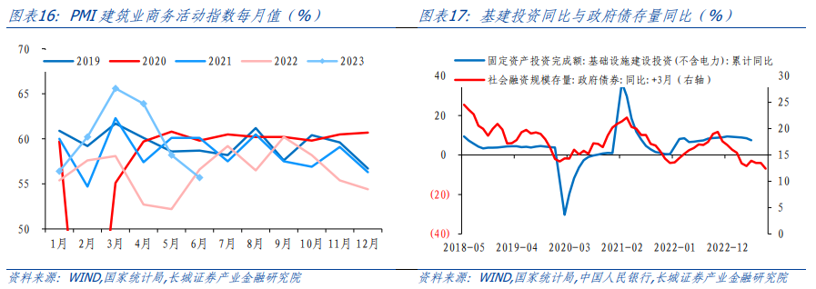 6月份建筑业商务活动指数环比继续回落2.5个百分点至55.7%,低于往年水平;建筑业新订单指数继续回落0.8个百分点至48.7%,连续两个月位于收缩区间,或预示基建投资增速将继续明显放缓,且地产投资与新开工仍不乐观。