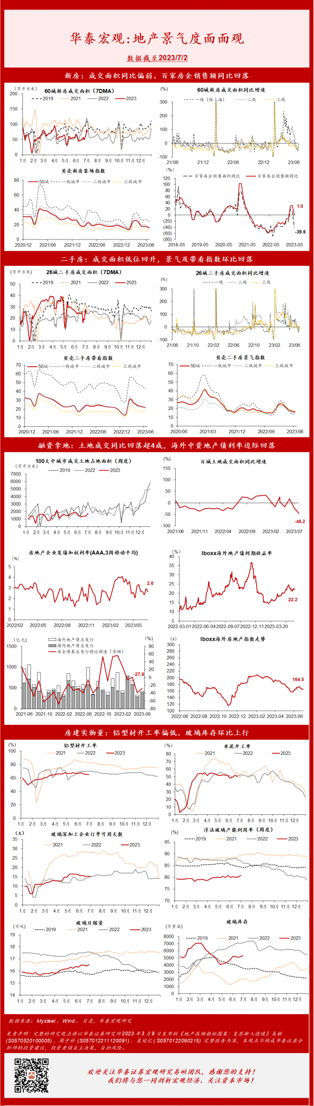 地产:商品房成交持续偏弱,库销比高位反弹。6月中旬,30城新房成交面积环比保持低位,14城二手房成交季节性回落。由于去年6月各地解封,带动地产成交走强,因而在同比维度,6月新房及二手房成交增速均明显下滑。但从两年复合增速来看,新房及二手房成交复合增速未明显下滑,整体仍有韧性。销售偏弱阻碍库存去化,十大城市库销比环比续升,并创同期新高。土地市场量减价升,但北京等地土拍底价成交情况增多,反映市场仍偏冷。