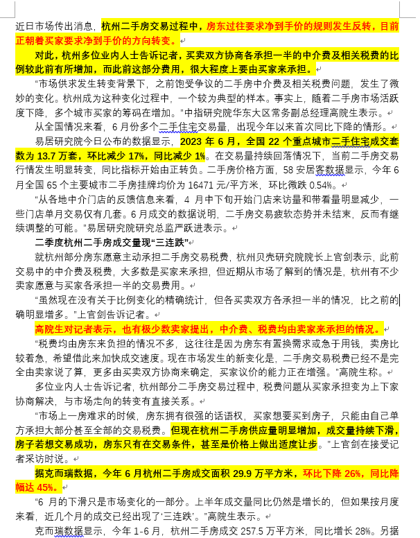 财联社:近日市场传出消息,杭州二手房交易过程中,房东过往要求净到手价的规则发生反转,目前正朝着买家要求净到手价的方向转变。对此,杭州多位业内人士表示,买卖双方协商各承担一半的中介费及相关税费的比例较此前有所增加,而此前这部分费用,很大程度上要由买家来承担。