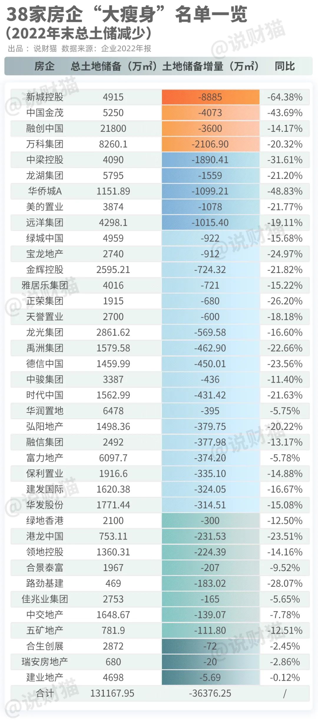 土地储备减少最多的是新城控股、中国金茂和融创中国,总土储减少8885万平米、4073万平米及3600万平米。这38家土地储备下滑的房企,2022年合计减少了3.64亿平米的土储。