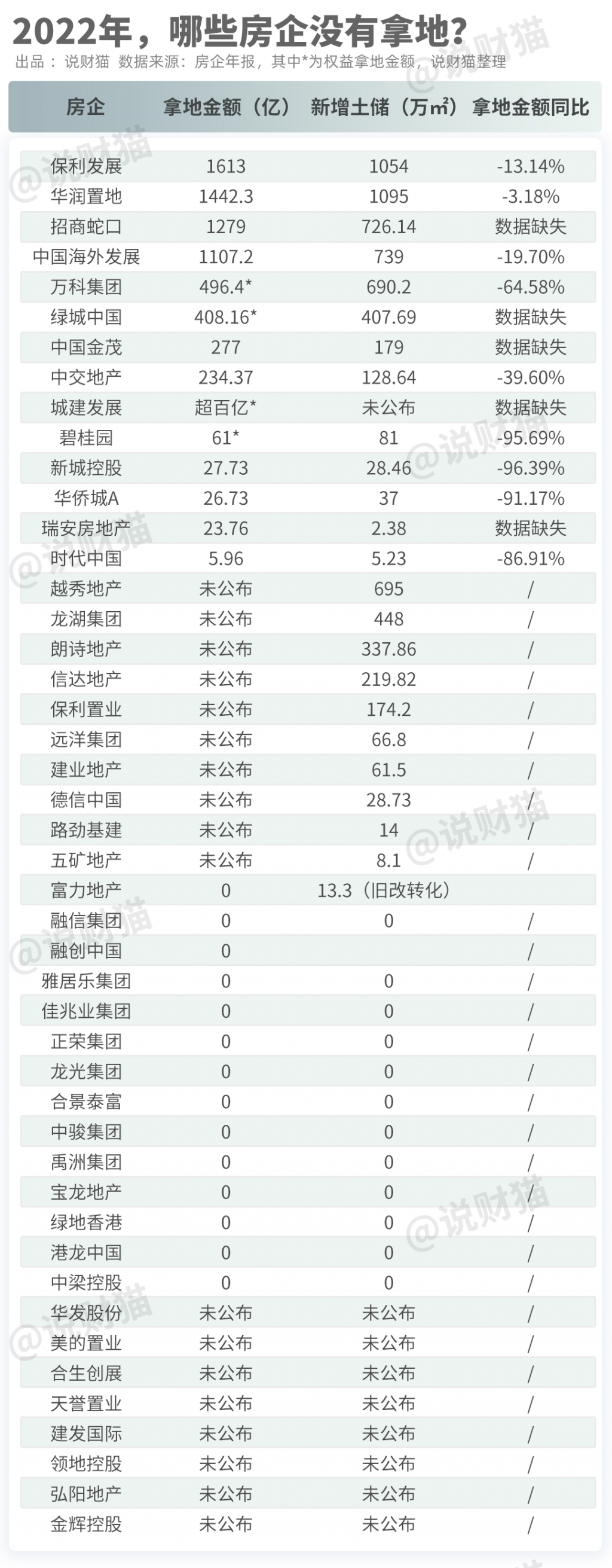 2022年,土地红利、杠杆红利、人口红利都彻底消失,房企不再为拿地疯狂,而是为偿债“发疯”。那么去年,哪些房企已经不拿地了?富力、融信、雅居乐、佳兆业、正荣、龙光、合景泰富、中骏、禹洲、宝龙、绿地香港、港龙中国、中梁...