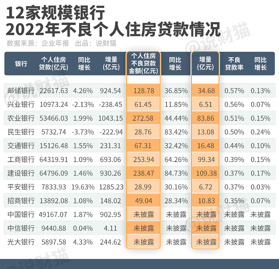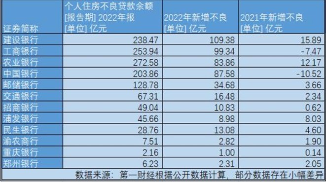 第一财经根据上市银行披露的数据统计发现,披露数据的12家上市银行去年个人住房不良贷款余额合计超过1300亿元,比2021年末增加约470亿元,而在2021年,同样这12家银行的个人住房不良贷款余额仅增加约33亿元。也就是说,2022年的新增额几乎是2021年新增额的14倍。尽管该数据包含了房屋抵押贷款,但作为银行最安全的资产之一,住房按揭贷款风险隐现。