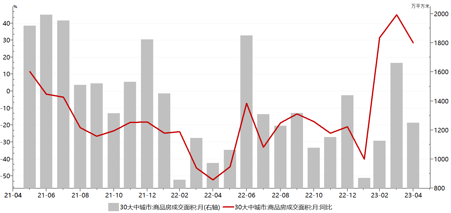 从商品房销售面积看,4月,30大中城市商品房成交面积同比增长28.4%,增速较上月回落16.6个百分点,出现显著回落。1-4月,品房成交面积累计同比增长10.9%,表现相对偏弱。