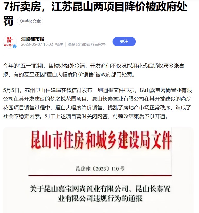 澎湃新闻:网传文件显示,昆山市两楼盘销售过程中,擅自大幅度降价销售,扰乱了房地产市场正常秩序,造成了社会不稳定因素。昆山市住建局人士表示,目前相关楼盘暂时关闭网签,待房企做好前期业主沟通解释工作及后续方案可行后,整改结束后会开通网签。