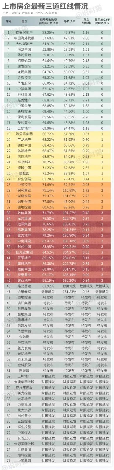 中国网:“三道红线”自发布至今已将近三年。数据显示,2022年三条红线全部踩中的红档房企有30家,较2021年增加9个。整体来看,房企三道红线的合格率不足3成,2022年有21家房企较2021年升档,仅6家房企实现降档。