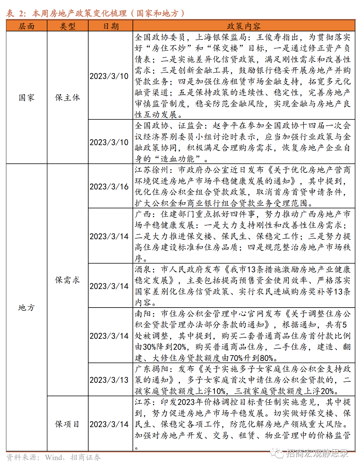 2023年一季度,中央对房地产表态整体延续积极,多次重申房地产支柱地位、支持刚性和改善性住房需求,相比去年四季度,高层表态中增加了“防风险”这一高频词。