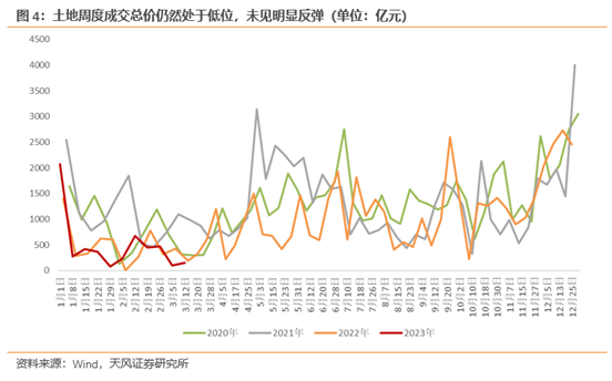 从高频数据来看,土地周度成交总价仍然处在较低的水平,相较于2022年同期,并未出现明显的改善。对于房地产投资而言,拿地是产业链条的第一个环节,当前拿地偏弱,也就意味着未来的开工大概率也会偏弱。
