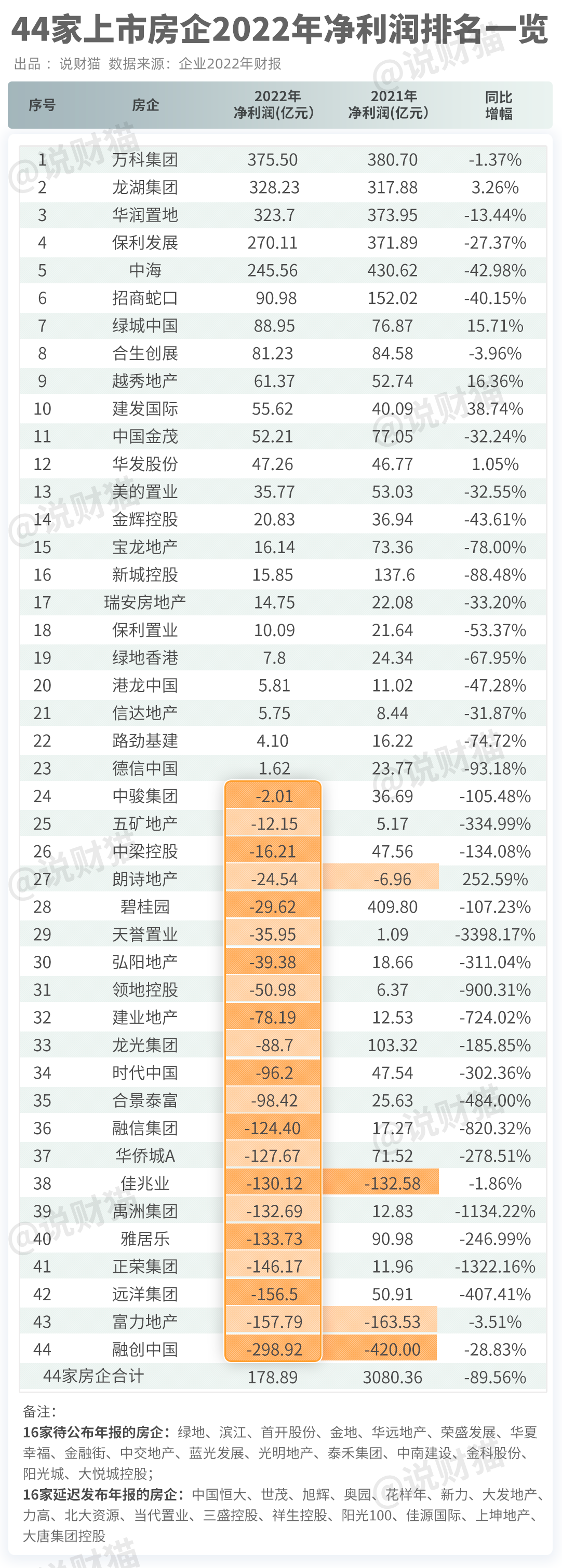 即是说,过去这一年,44家房企营收、利润齐跌:营收少了4200亿、毛利减少2800,净利润少了2900亿。