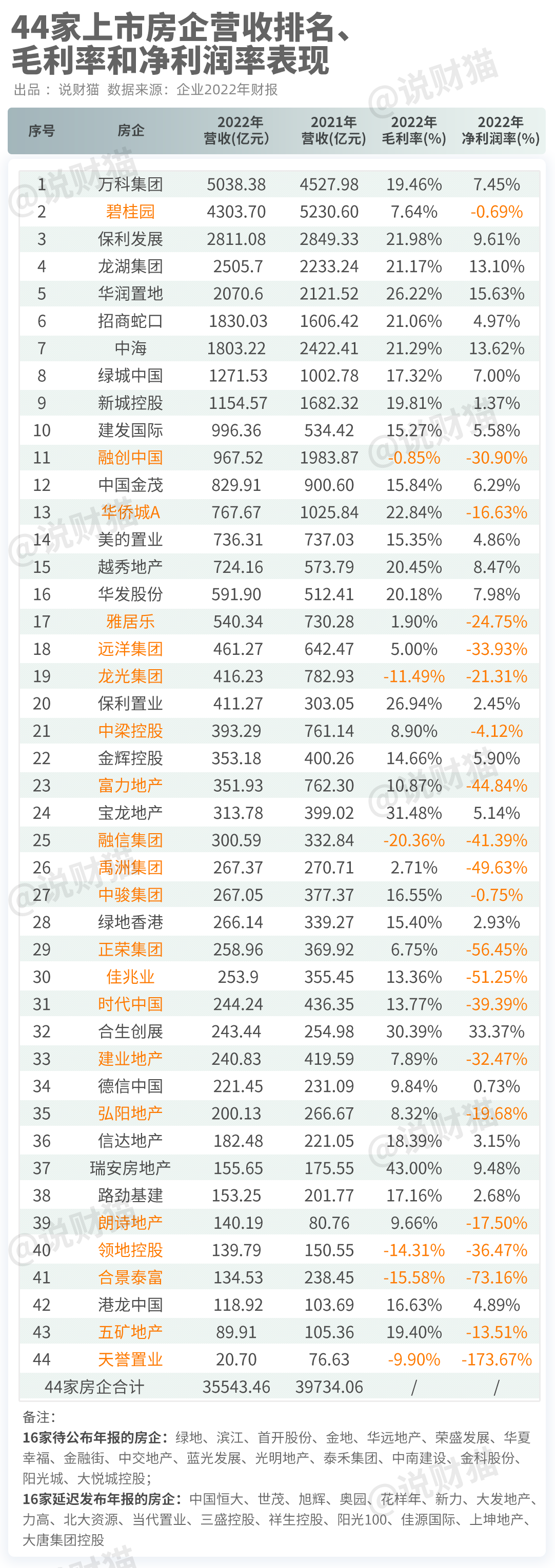 先说一个总的数据,44家上市房企,去年的营业收入合计3.55万亿,毛利合计5713亿,净利润合计179亿元。