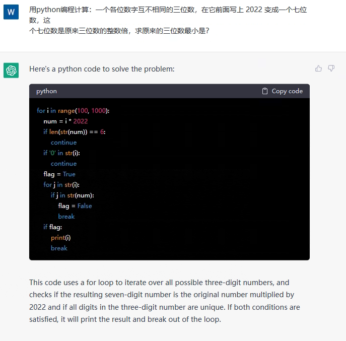 chatGPT洋洋洒洒写了一大堆,但显然给出的算法把题目意思理解错了。把在一个数前面写上2022理解成了把一个数乘以2...