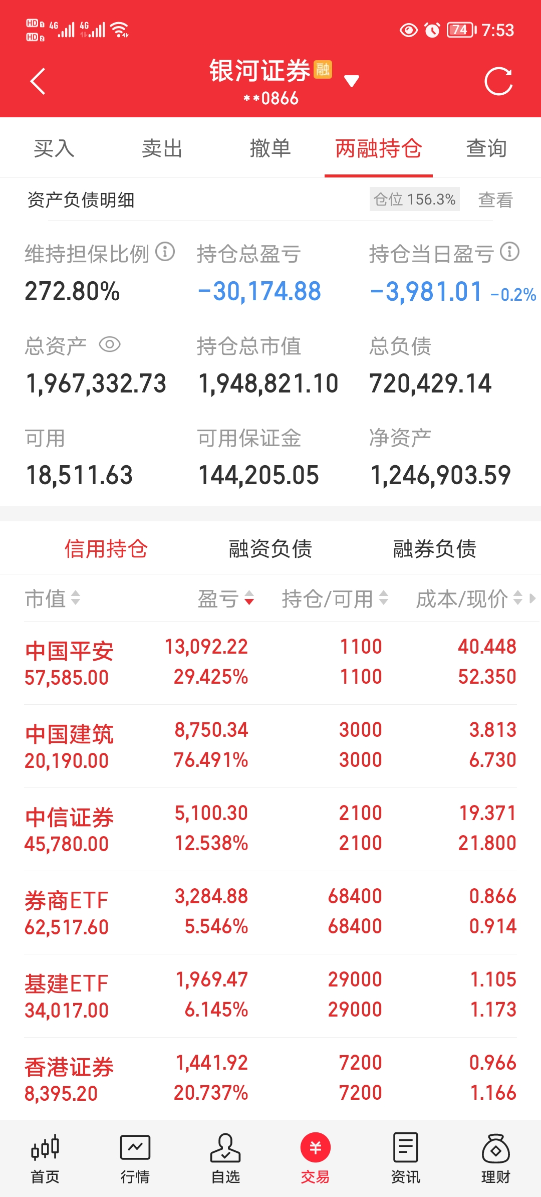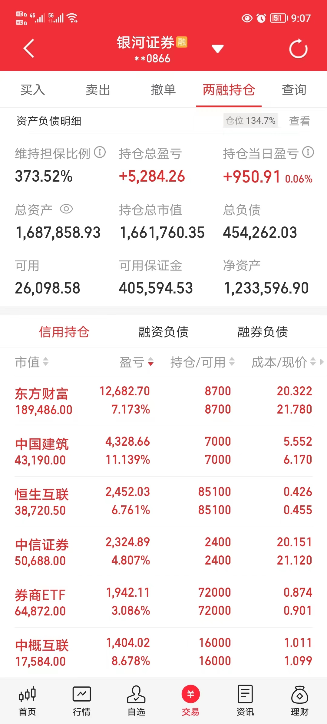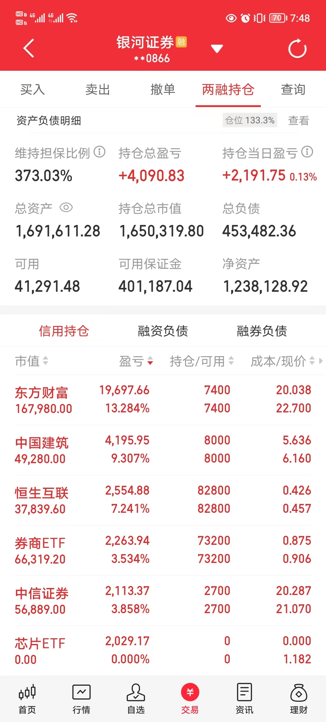 仓位156%,融资负债73.7万,现金可用3.8万元,融资可用13.3万元。