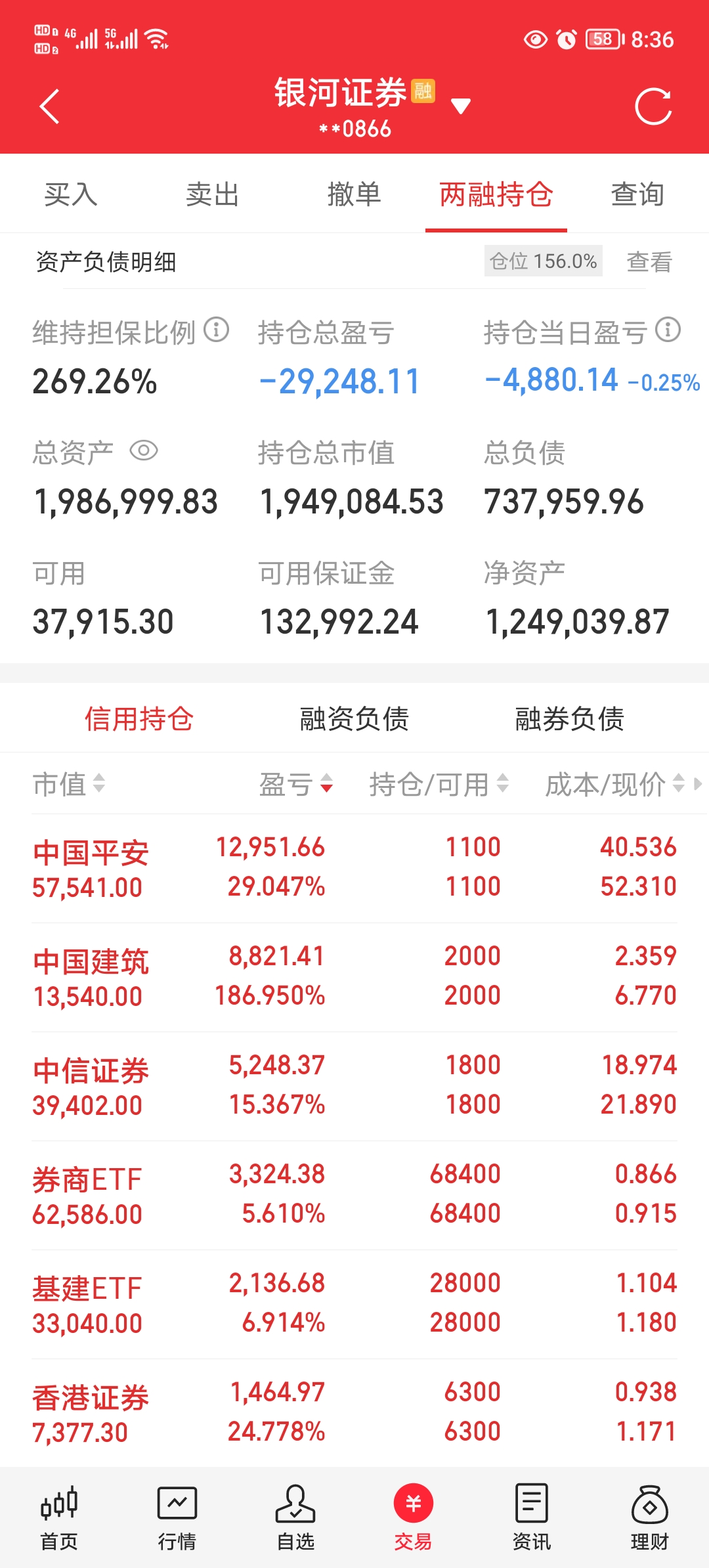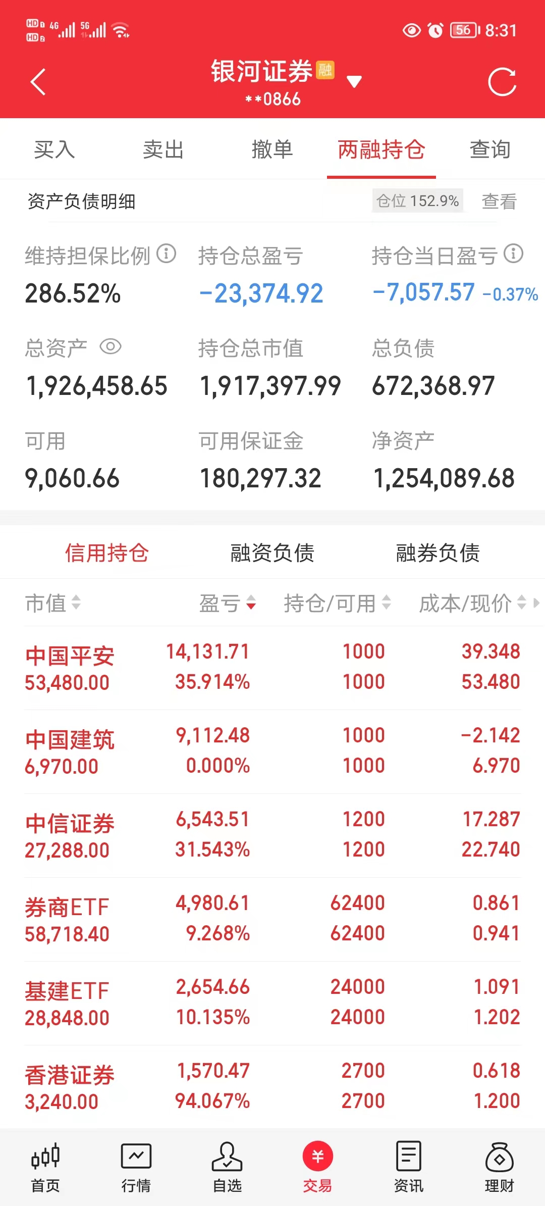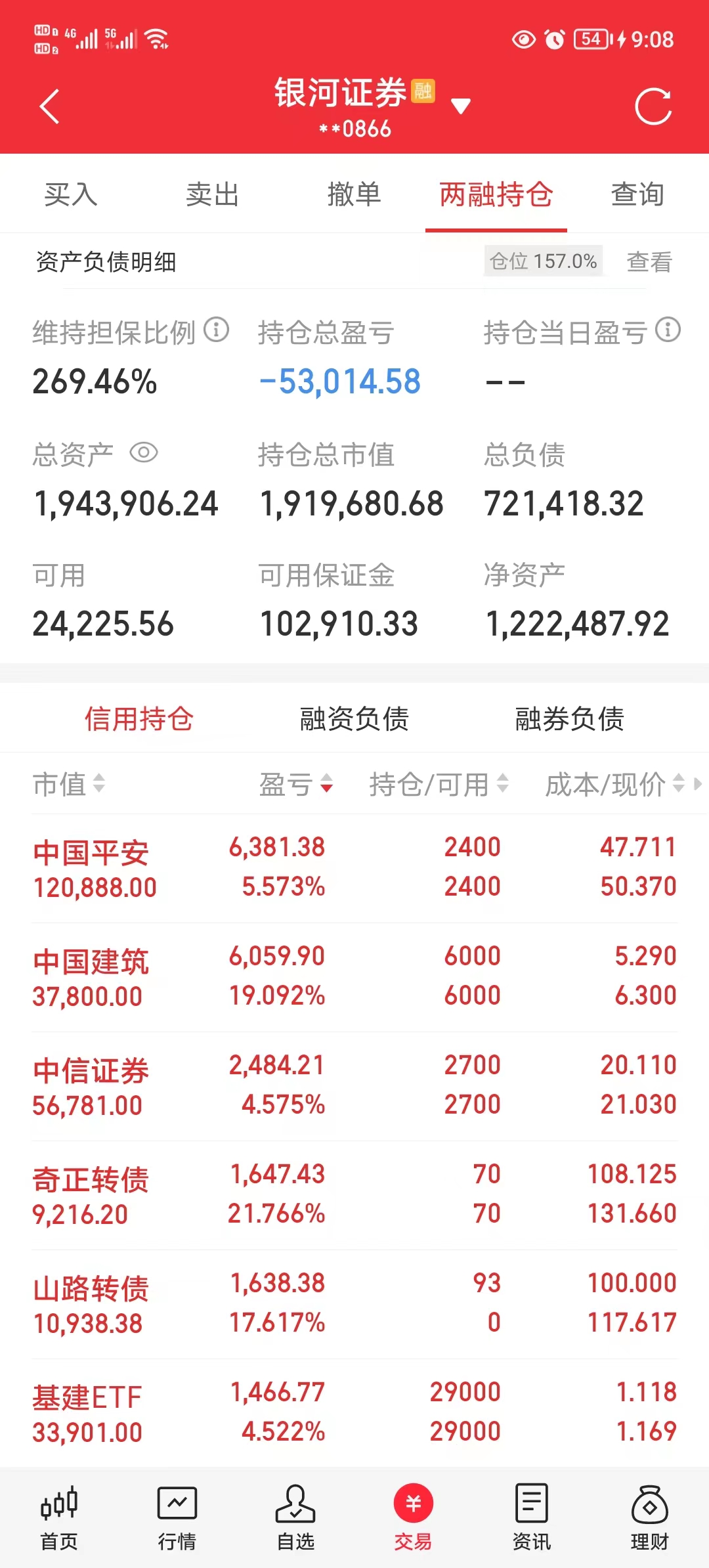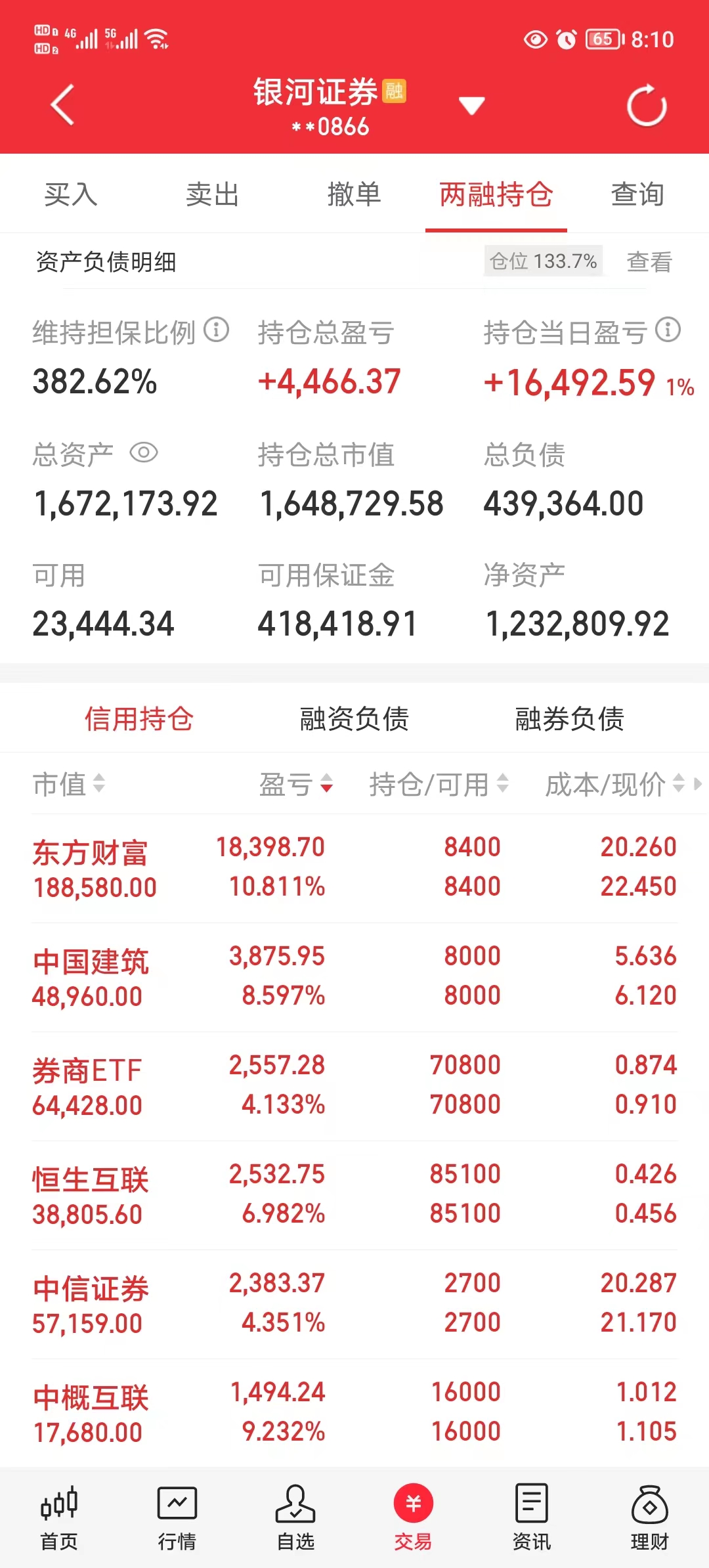 仓位156%,融资负债73.7万,现金可用3.8万元,融资可用13.3万元。