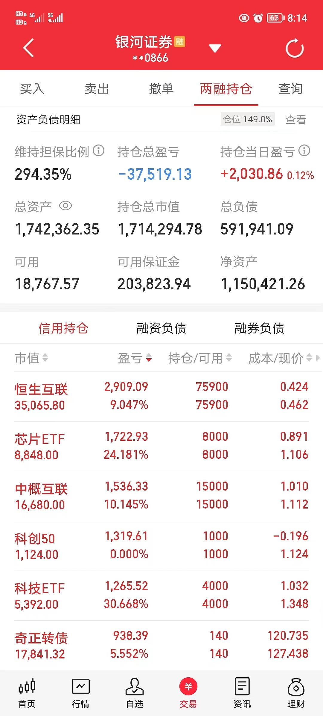 仓位149%,和上周仓位一致,余1.8万现金,20万融资额度。