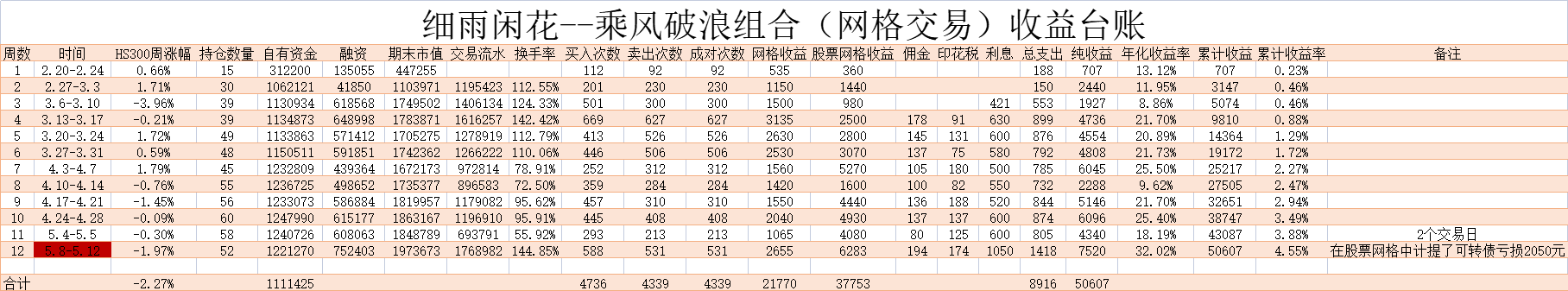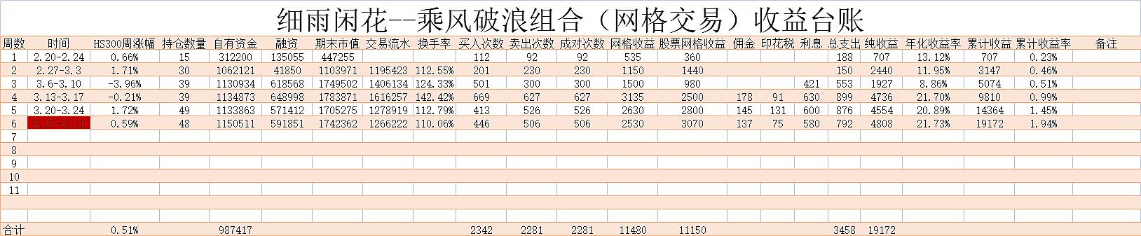 本周投入资金1150511元,融资负债591851元,周成交额1266221元,换手率110.06%,买入446次,卖出506次,成对506次,ETF、可转债网格收益2530元,股票网格收益3070元(含恒生互联、中概互联高开额外收益),支出(佣金137、利息580、印花税75)计792元,纯收益4808元,年化收益率21.73%,累计收益19172元,累计收益率1.94%。