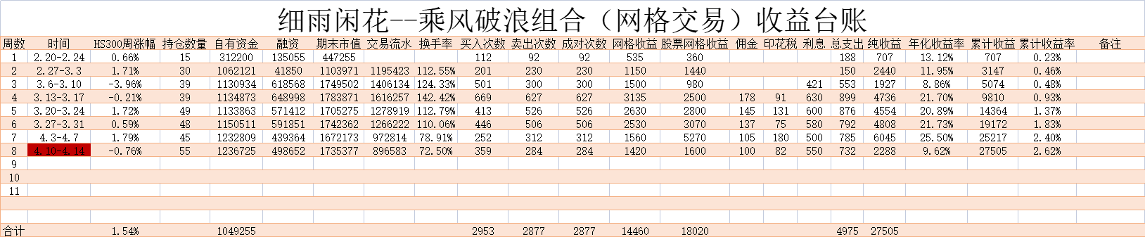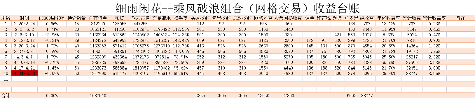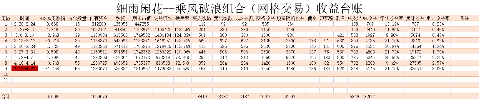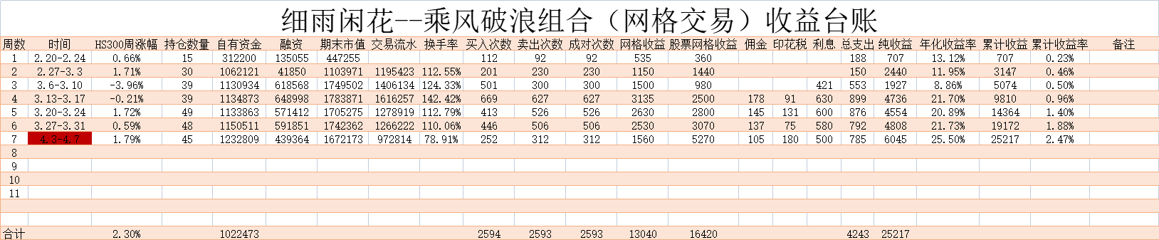 本周投入资金1232809元,融资负债439364元,周成交额972814元,换手率78.91%,买入252次,卖出312次,成对312次,ETF、可转债网格收益1560元,股票网格收益5270元(含恒生互联、中概互联高开额外收益),支出(佣金105、利息500、印花税180)计785元,纯收益6045元,年化收益率25.5%,累计收益25217元,累计收益率2.47%。