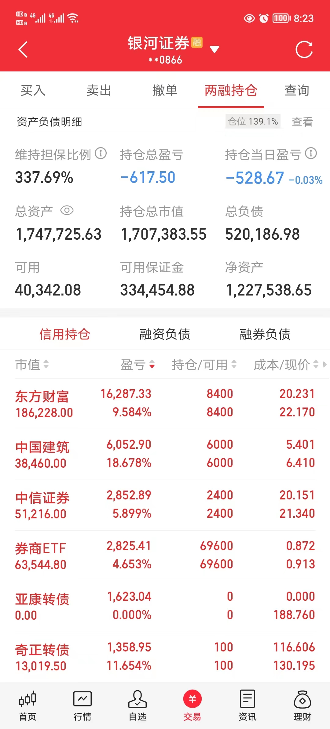 仓位133.7%,余2.3万现金,41.8万融资额度。