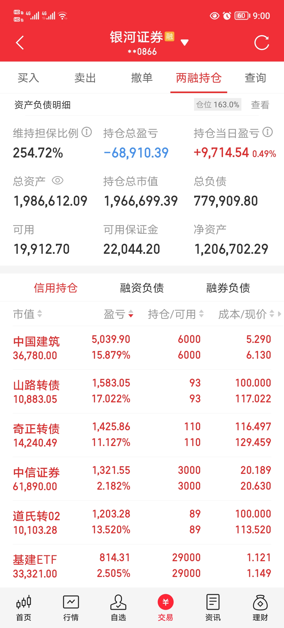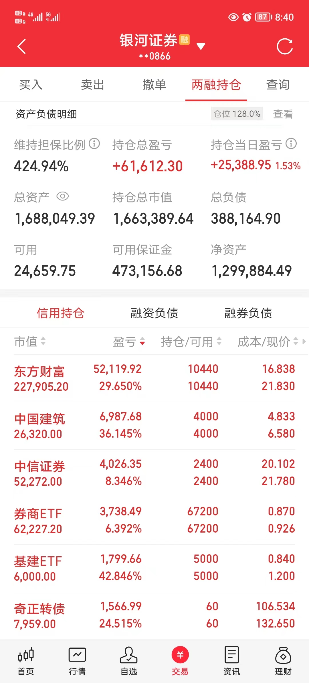 仓位160.5%,余1.3万现金,9.7万融资额度。