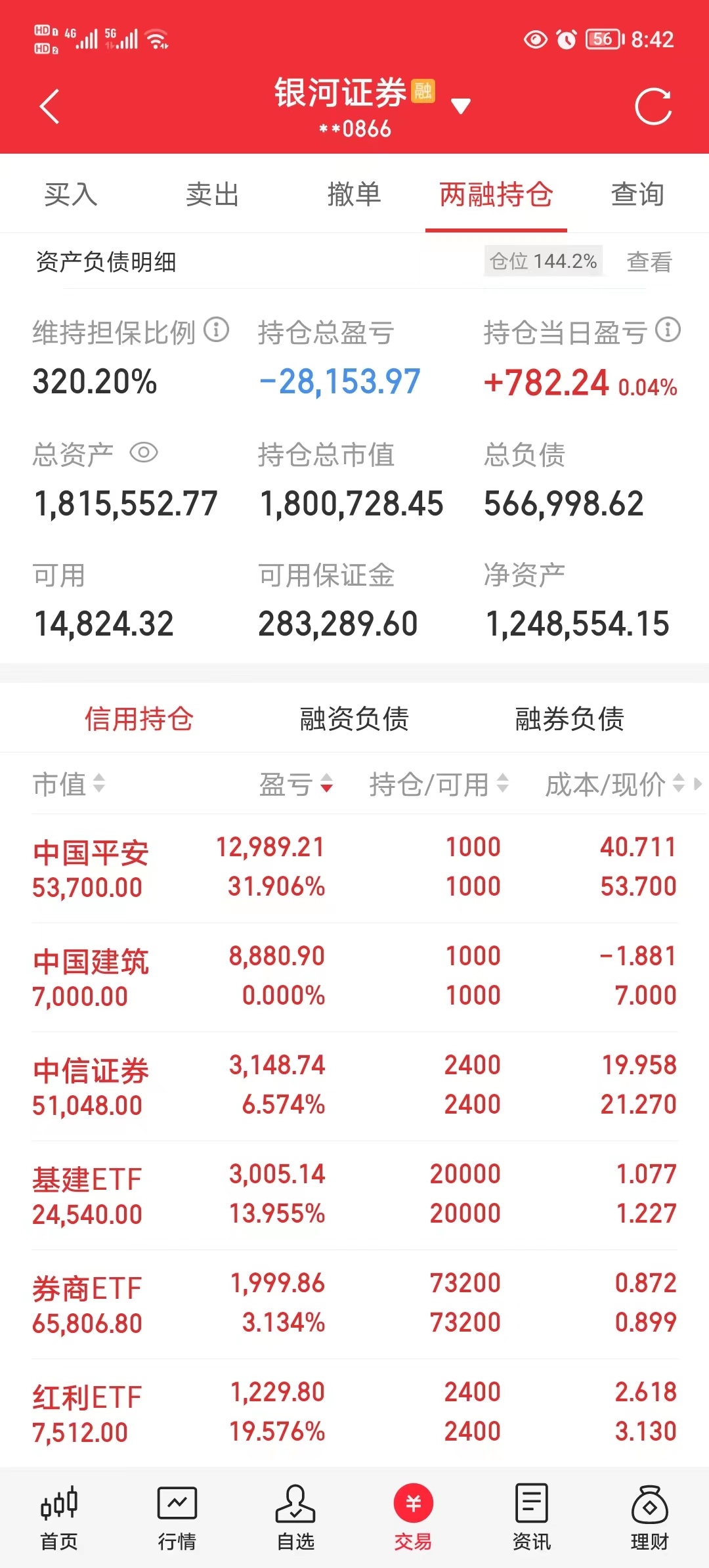 仓位156.3%,融资负债72万,现金可用1.8万元,融资可用14.4万元。