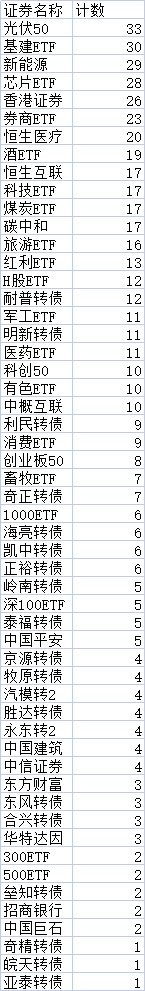 第11周交易次数前5的是:光伏50ETF、基建ETF、新能源、芯片ETF、香港证券。