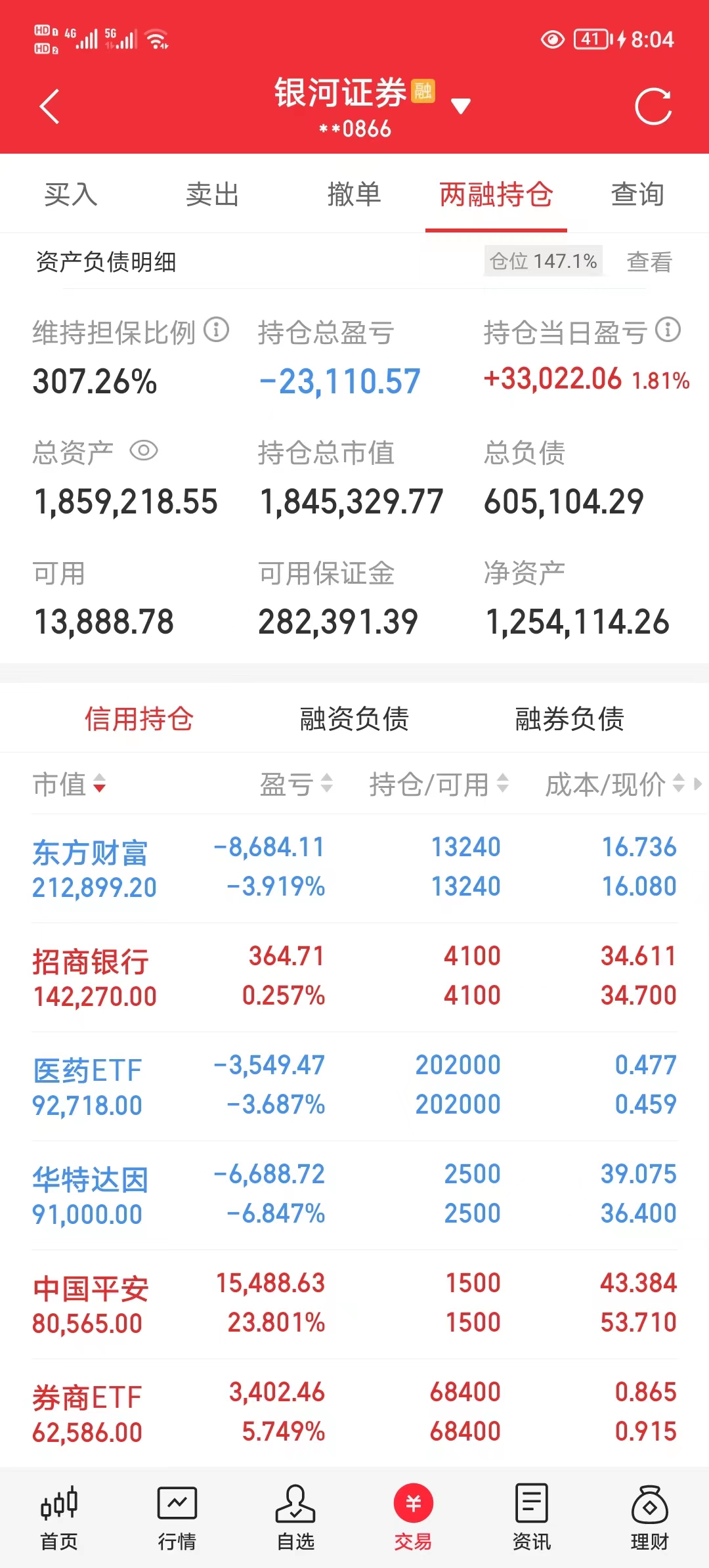 仓位160.5%,余1.3万现金,9.7万融资额度。