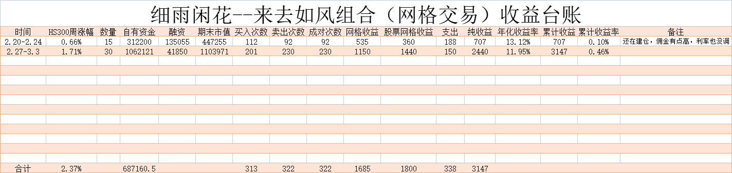 本周投入资金1062121元,买入201次,卖出230次,成对230次,ETF网格收益1150元,股票网格收益1440元,支出(佣金、利息、印花税等)150元,纯收益2440元,年化收益率11.95%,累计收益3147元,累计收益率0.46%