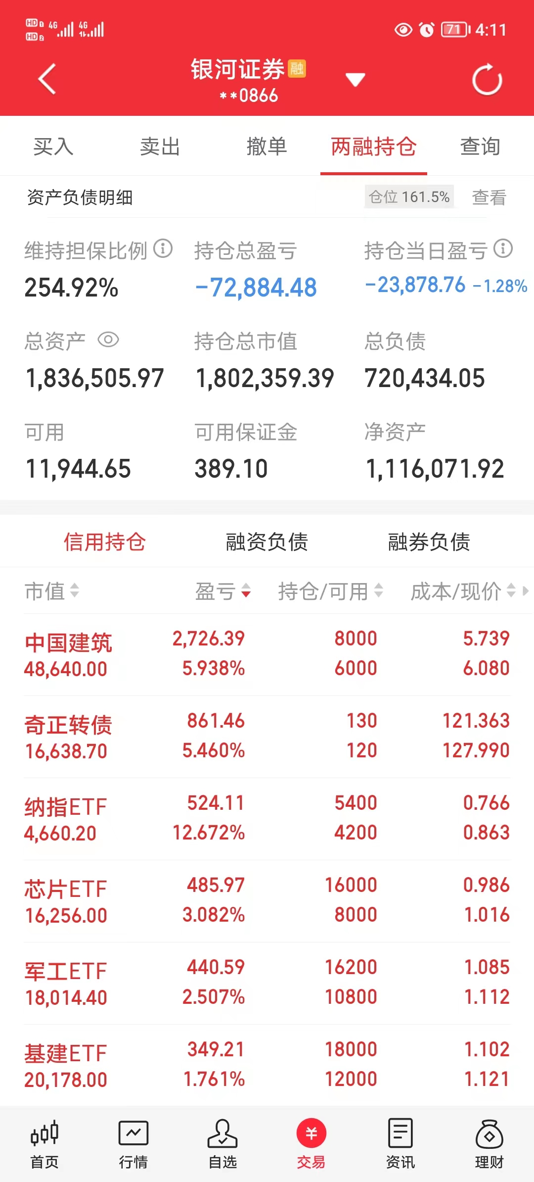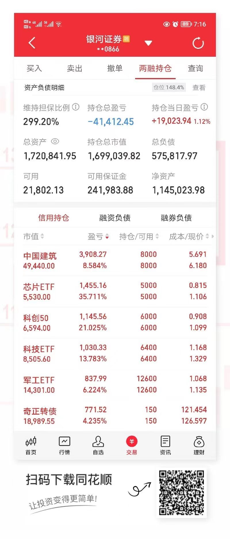 主要是ETF,占比50%+,为什么用ETF呢?一是没有印花税;二是佣金低,万0.6;三是行业指数不会消失,向下的被深套的几率小,买进所有行业,向下一起被套的几率更小;四是下跌的时候可以用融资买入。解决了资金不足的痛点。