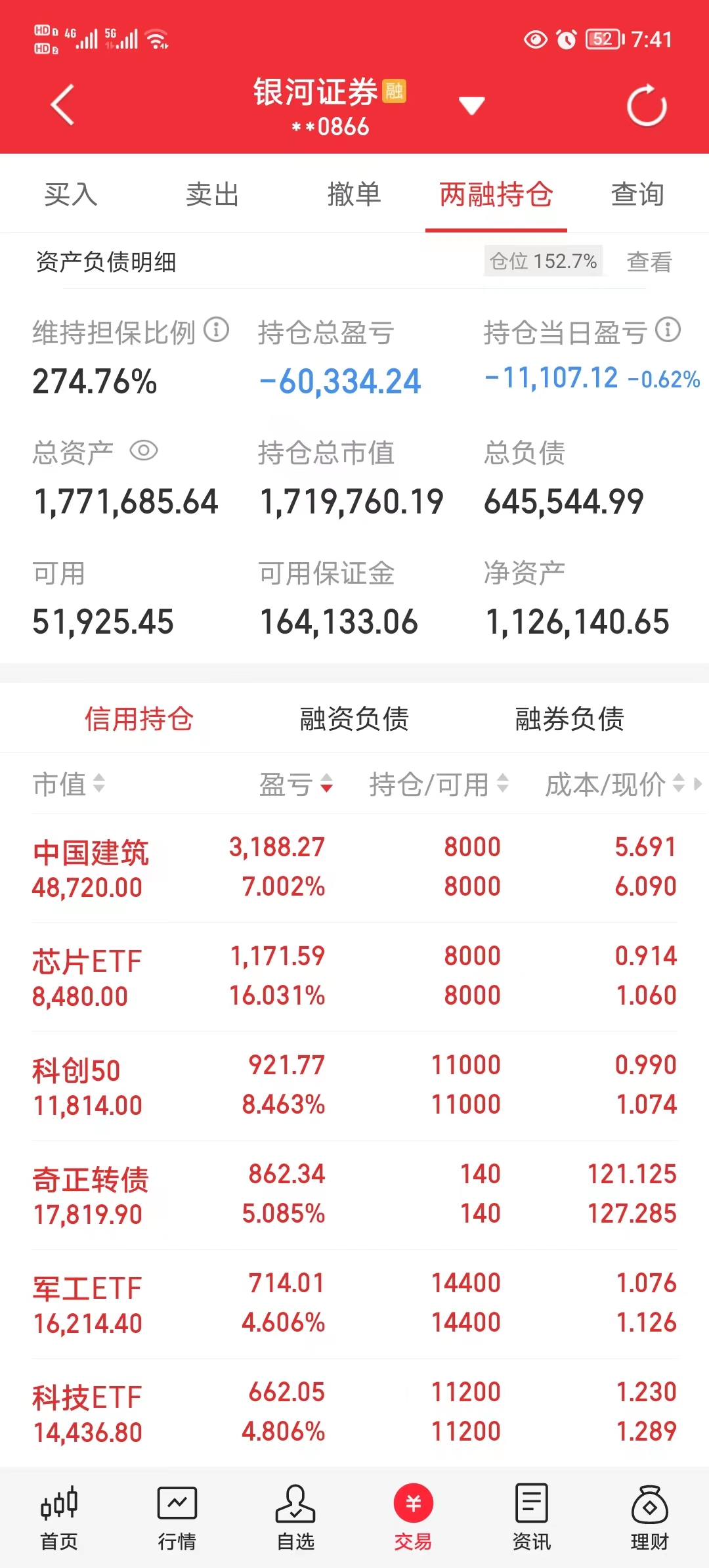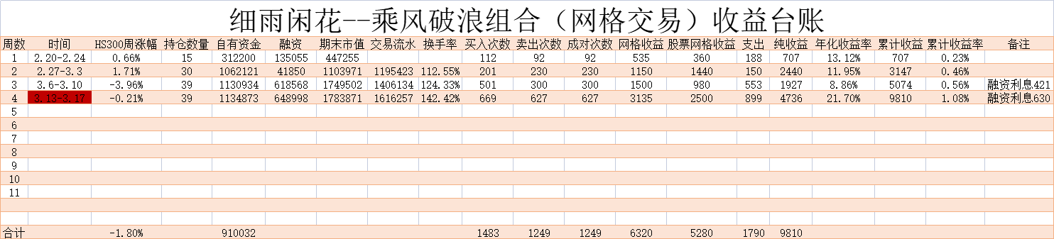 本周投入资金1130934元,融资负债619103元(融资利息支出421元,最大的成本),买入501次,卖出300次,成对300次,ETF、可转债网格收益1500元,股票网格收益980元,支出(佣金、利息、印花税等)553元,纯收益1927元,年化收益率8.86%,累计收益5074元,累计收益率0.61%。