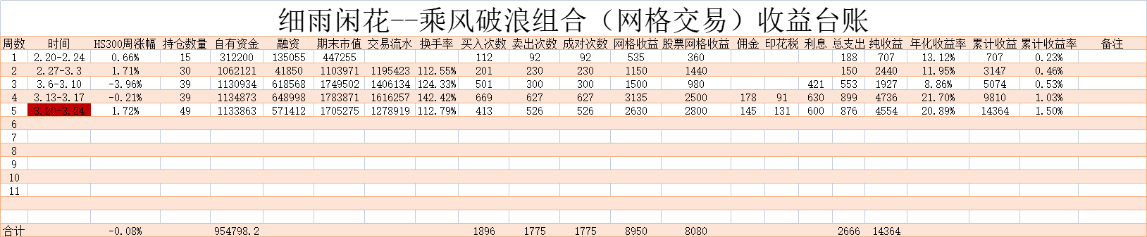 本周投入资金1133863元,融资负债571412元,买入413次,卖出526次,成对526次,ETF、可转债网格收益2630元,股票网格收益2800元,支出(佣金145、利息600、印花税131)计876元,纯收益4554元,年化收益率20.89%,累计收益14364元,累计收益率1.5%。