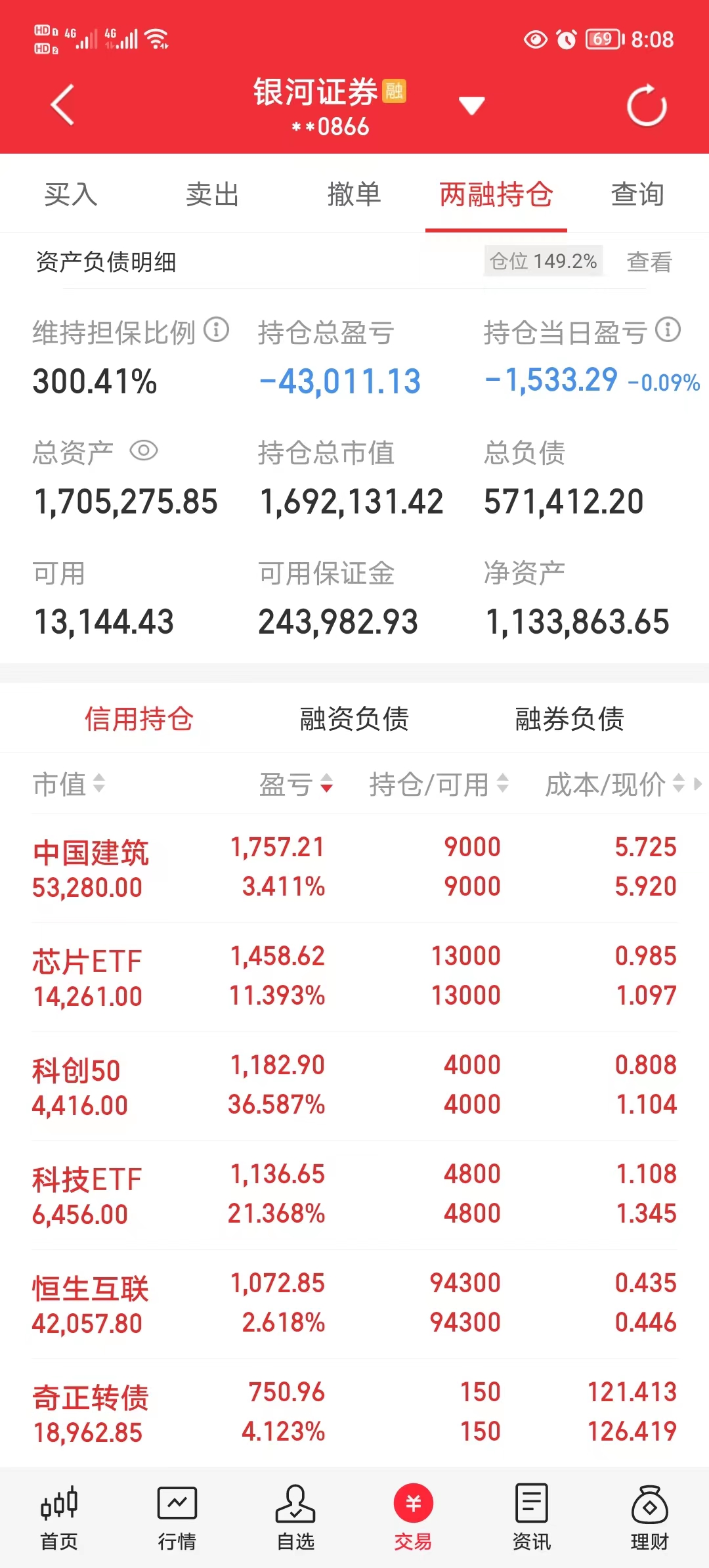 由于仓位打得太满,格子太小,本周一直在补仓,融资负债已经超过60万,可用保证金也只剩下12万了。我设计的网格,每个标的买进了20份底仓,预留的资金和融资额度,预计可以抗整体仓位下跌10%,即指数跌到3000点。但预计得有一些乐观,下周再不反弹,就只有装死了。60万负债里面,网格买进的股票占了一半,中国平安周下跌8.5%,东方财富周下跌6.9%,惨。。。。。。