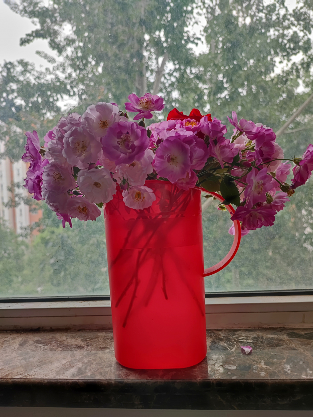 我最近也有福利。公园新种大批月季,已经陆续开花了。正在打顶,很多花都剪掉了。我前几天在西边捡了一堆,用帽子兜回来的。今天,去西边公园,同样,又装了两口袋回来。还要巡园,来不及捡更多。太好了,五一节礼物。