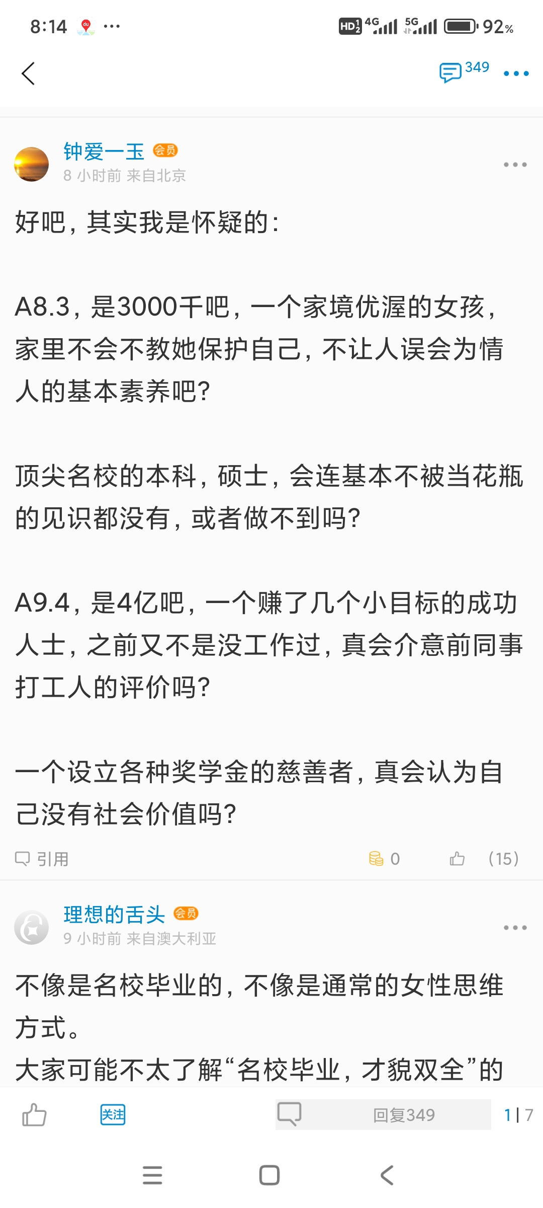 本论坛A9全职女求惑帖,之前类似闹剧,还是在雪球,某女抄作业业绩爆表,附逆袭翻盘经历,很励志啊,是真是假大家吵得不亦乐乎,后来删帖销户了。赶紧把自己的回复截屏留存,不然锁帖删帖就没啦。女人看女人更客观,那个主帖描述的一看就是男人眼里的白富美。如果是现实生活里,有A9级有能力的白富美,没有一个不是眼高于顶的:)。来集思录高净值客户多的地方打窝来了