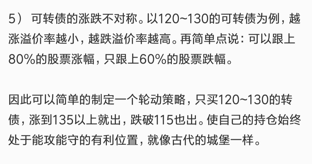 5) 可转债的涨跌不对称。以120~130的可转债为例,越涨溢价率越小,越跌溢价率越高。再简单点说:可以跟上80%的股票涨幅,只跟上60%的股票跌幅。