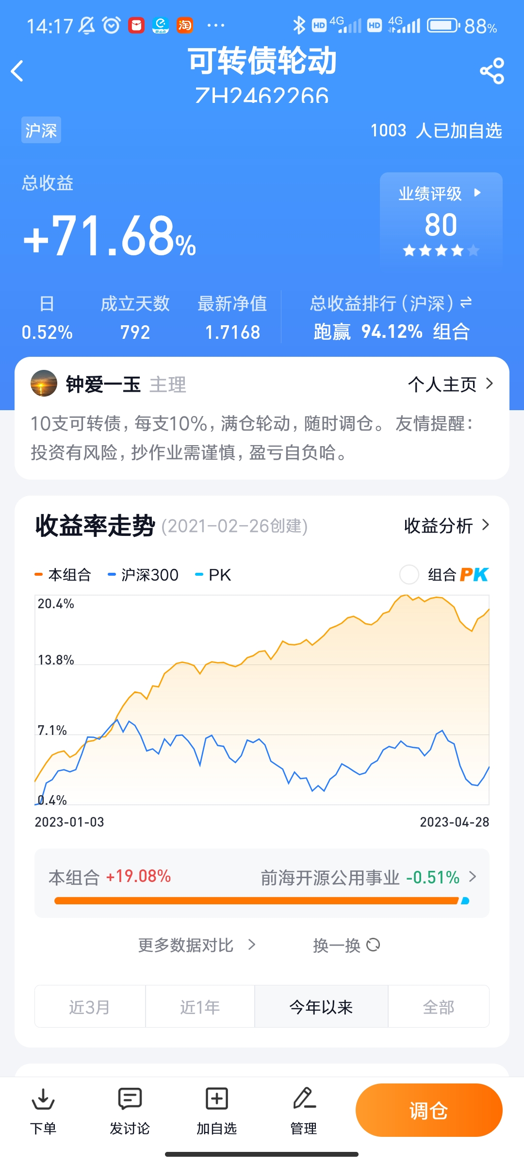 可转债轮动,今年+14.83%,今天-1.88%,跑输,可转债等权一1.72%,沪深300-1.33%。跑输,主要是因为持仓里有9%左右的全筑。
