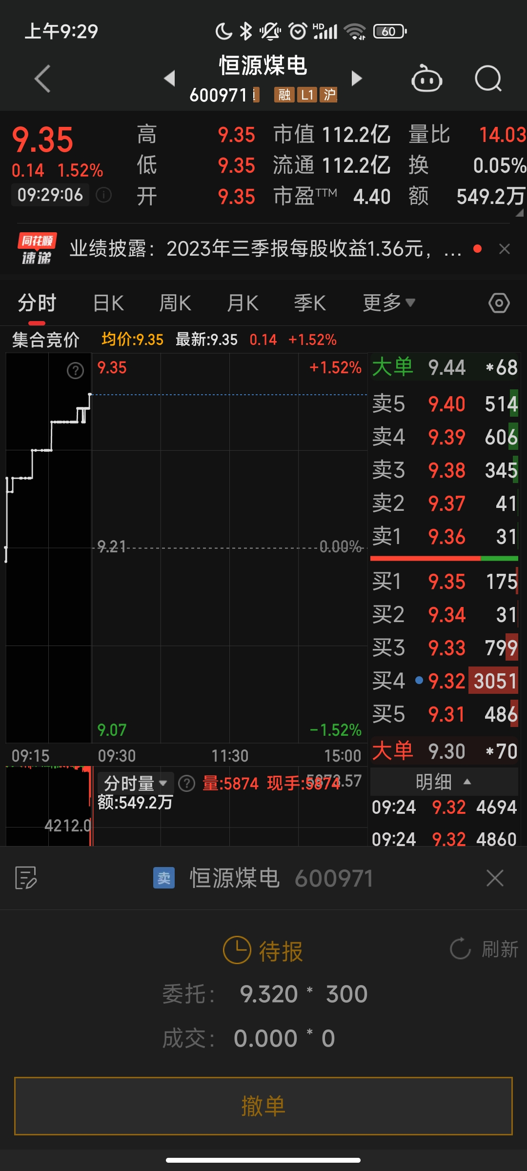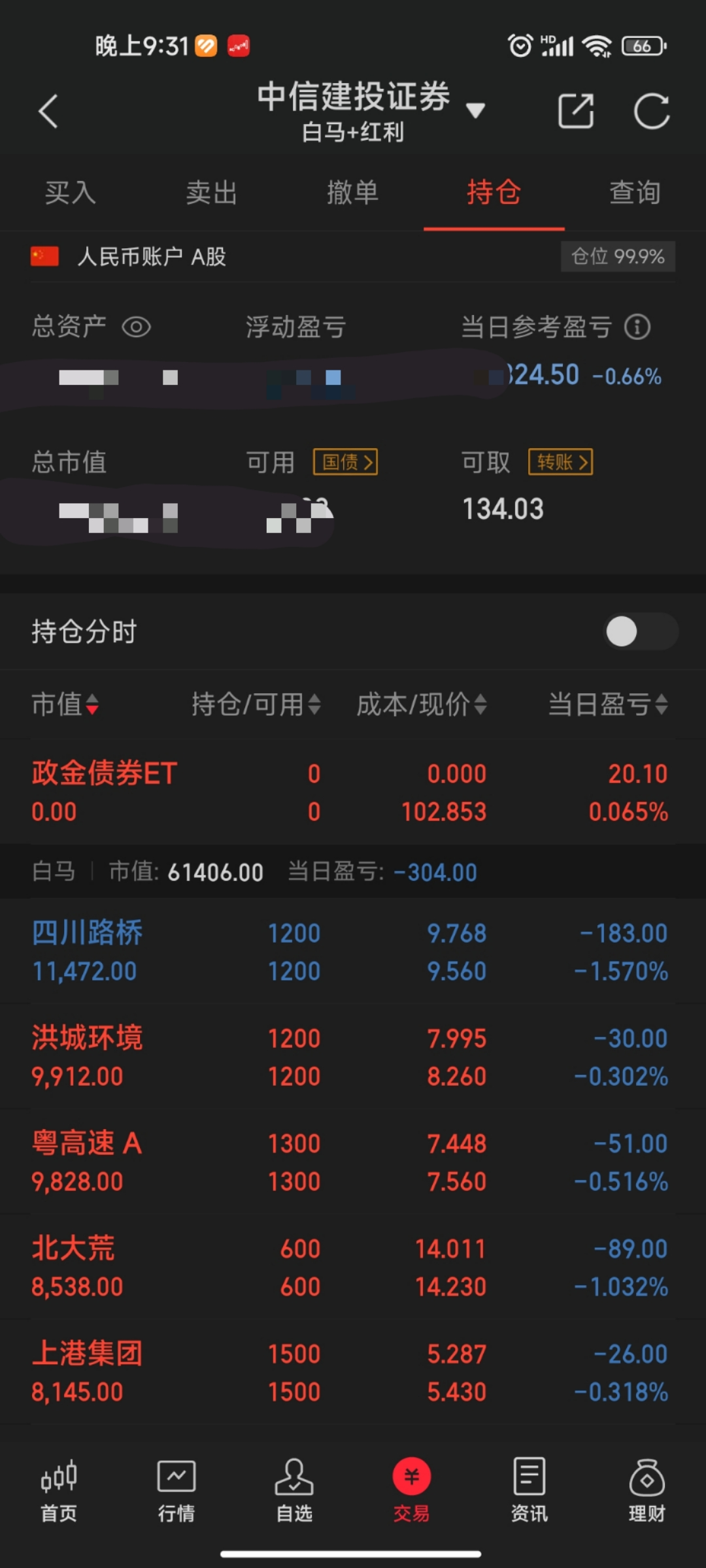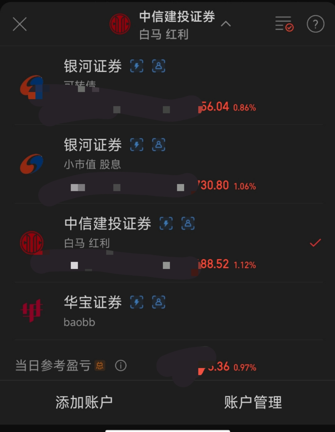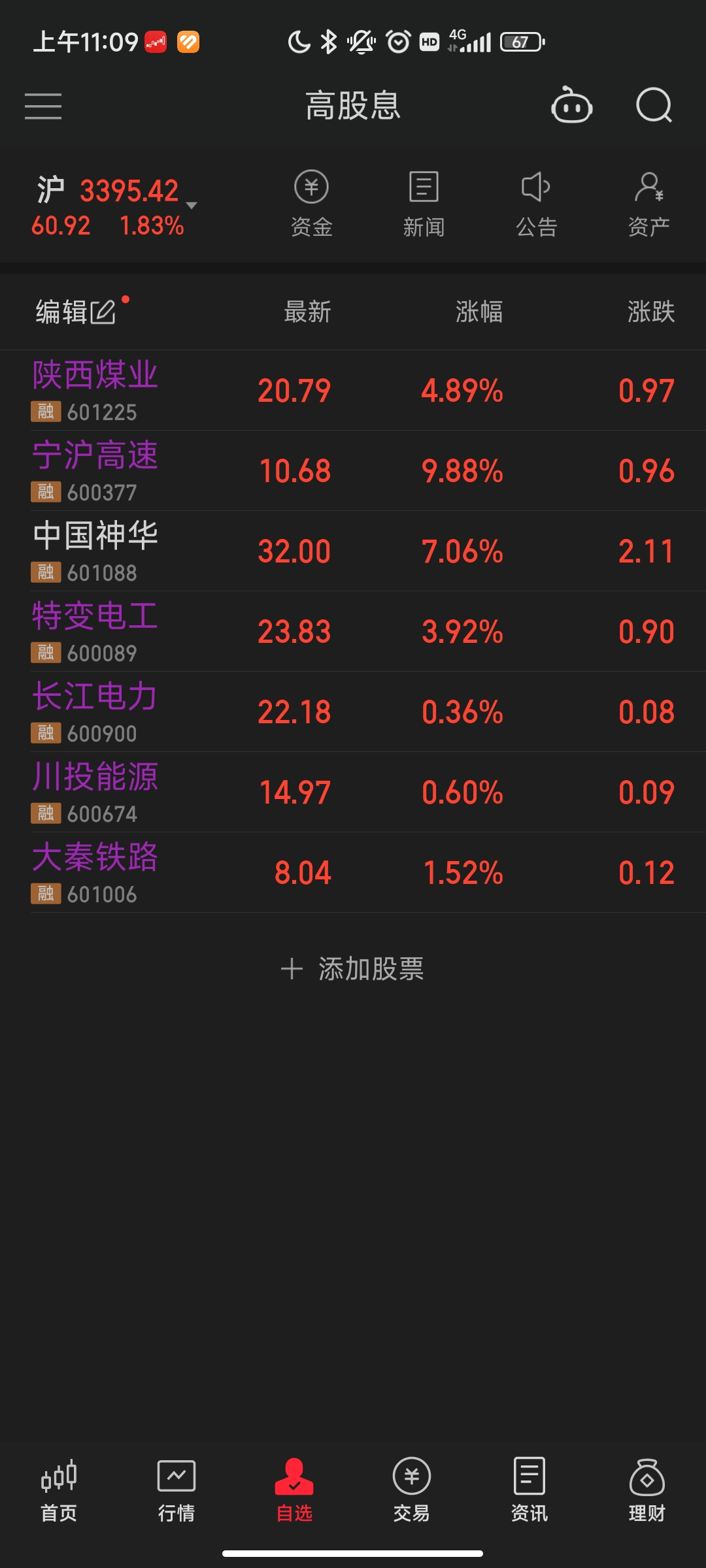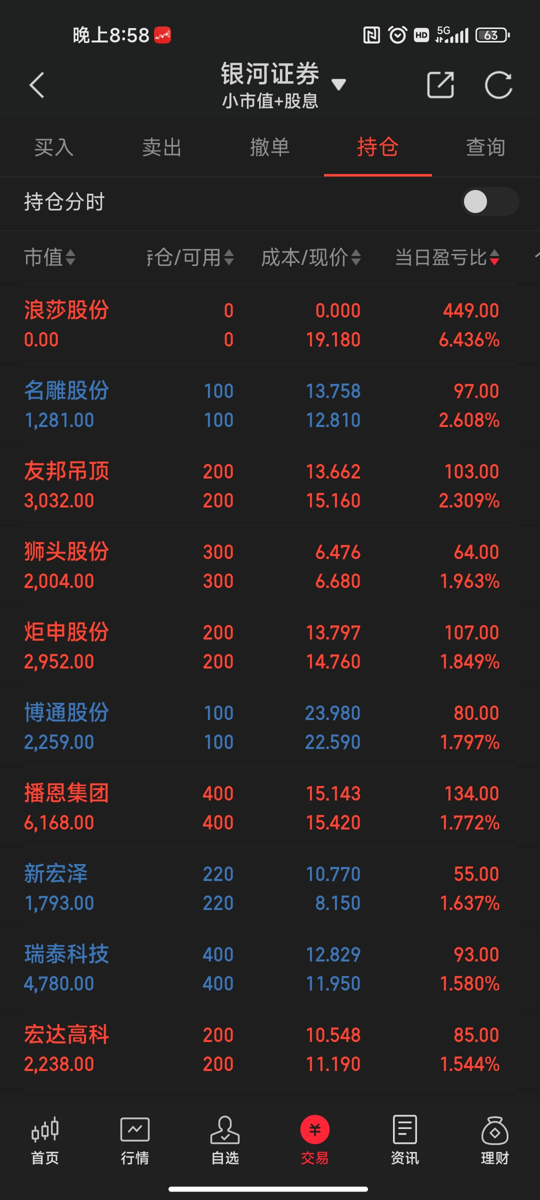 上周五一顿卖卖卖,有大把现金,不想浪费,去买了高股息陕西煤业交通银行,结果今天亏惨了。眼看着群友一个个挣1%,我只有可怜的0.15%感谢南钢股份,今天又赚大钱了忘了一个恒源煤电,周五还加仓了恒源煤电,感谢恒源煤电