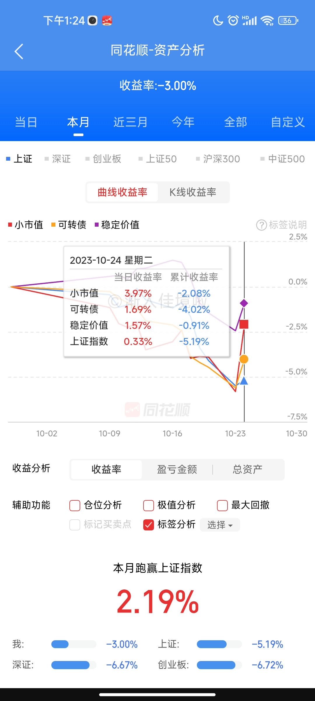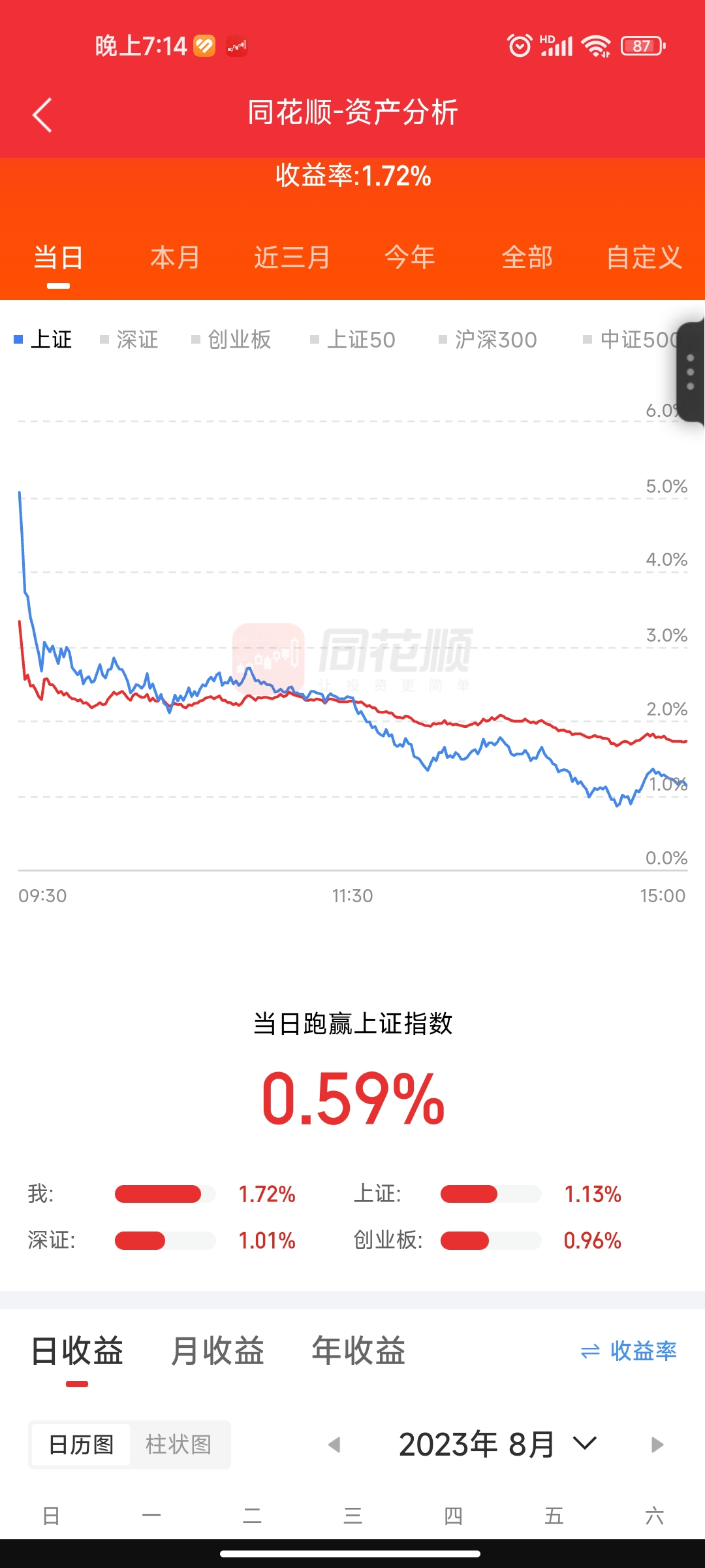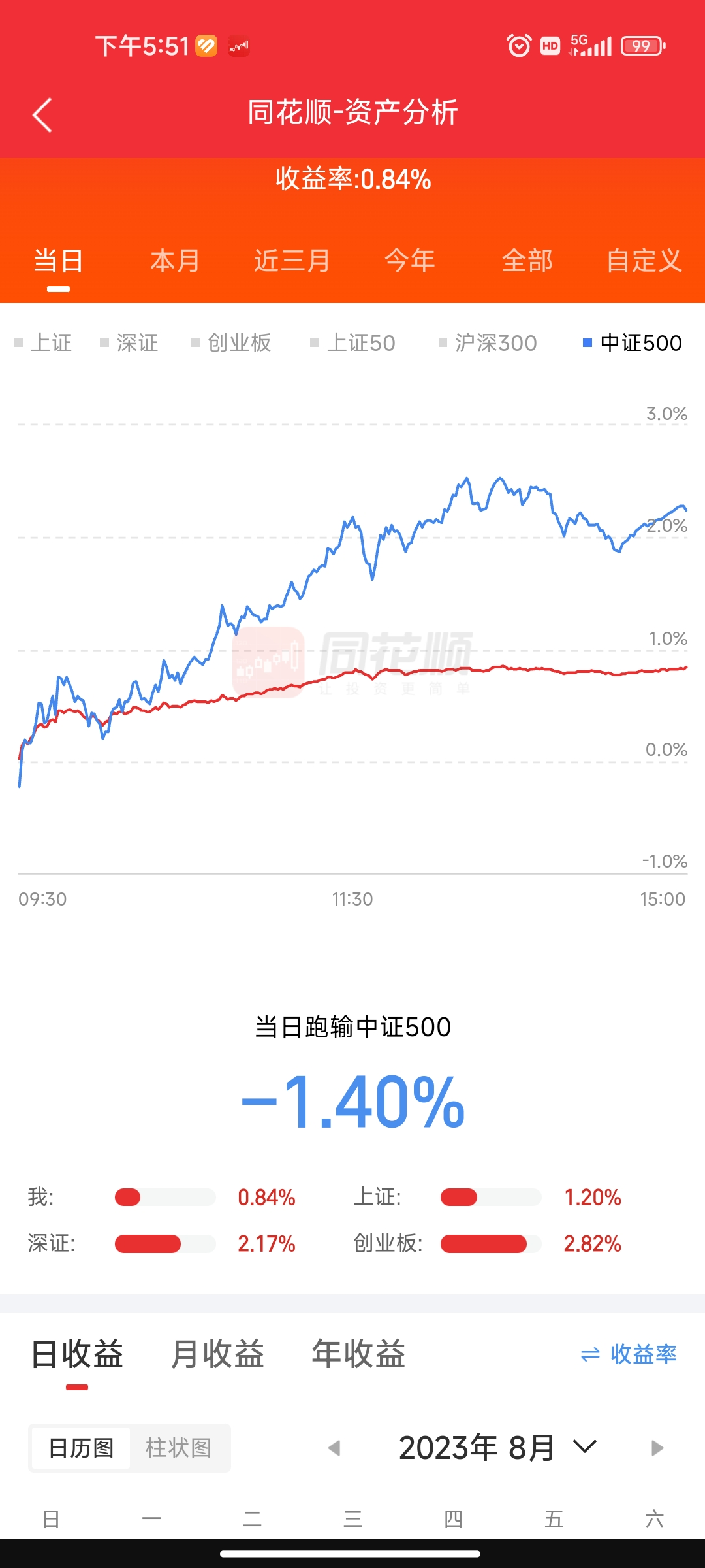 但是我又不甘心早上那7%的指数ETF的涨幅,我看到我8月份的亏损一下子就回本了,我没有经受得住诱惑,我在九点半前手动挂了很多卖单。主要是将小市值减仓2/3,ETF减仓1/3,可转债没有太突出的就没有怎么减仓,只把涨停的敖东转债清仓了。合计减仓40%仓位。2023.8月还亏1.2%,争取明后天赚回来。