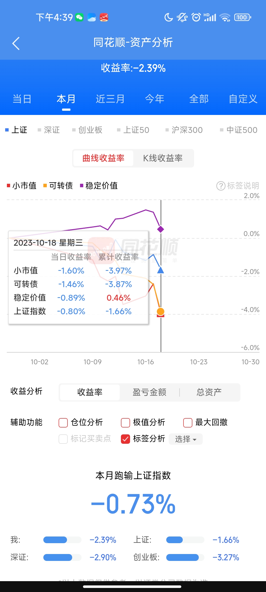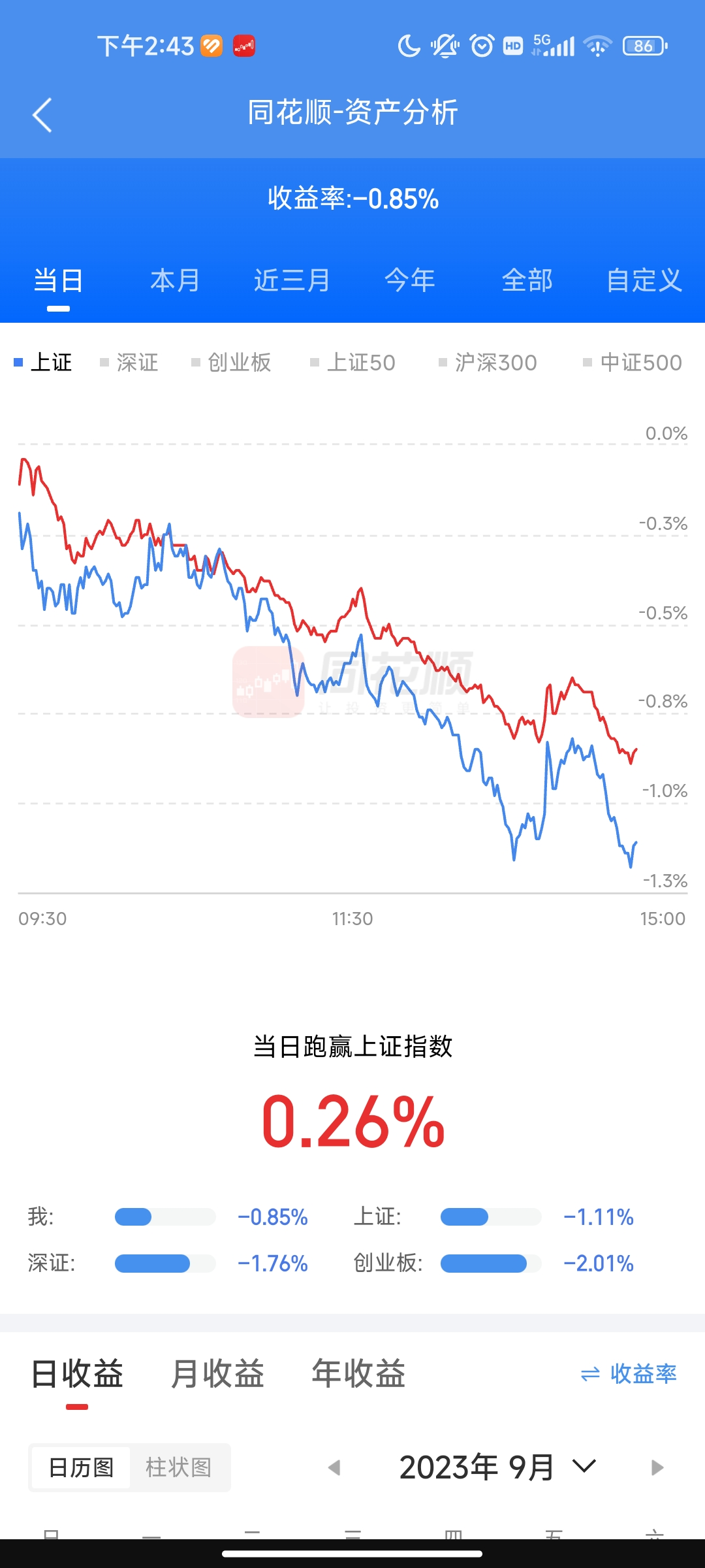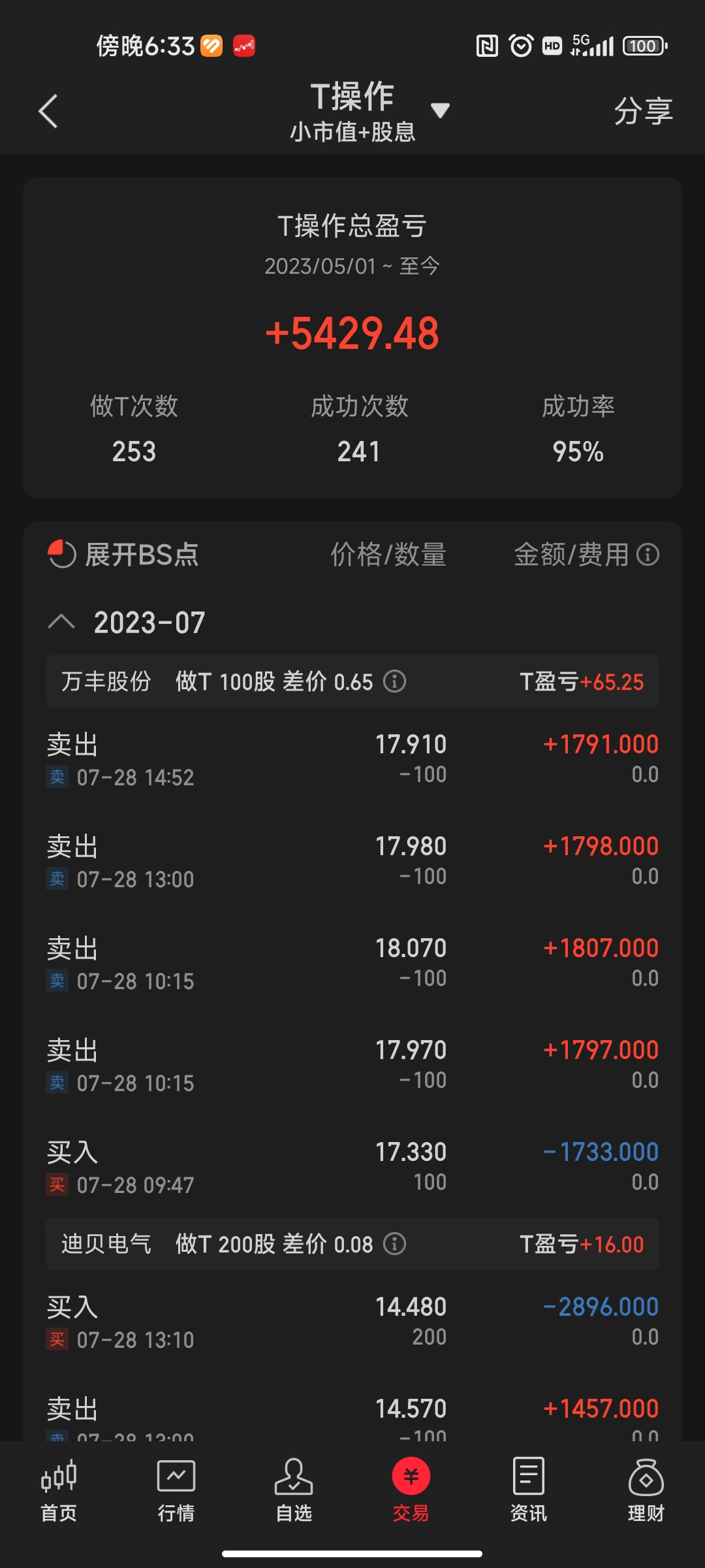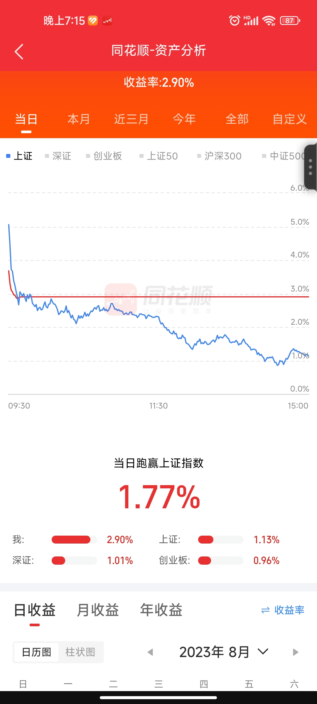 但是我又不甘心早上那7%的指数ETF的涨幅,我看到我8月份的亏损一下子就回本了,我没有经受得住诱惑,我在九点半前手动挂了很多卖单。主要是将小市值减仓2/3,ETF减仓1/3,可转债没有太突出的就没有怎么减仓,只把涨停的敖东转债清仓了。合计减仓40%仓位。2023.8月还亏1.2%,争取明后天赚回来。