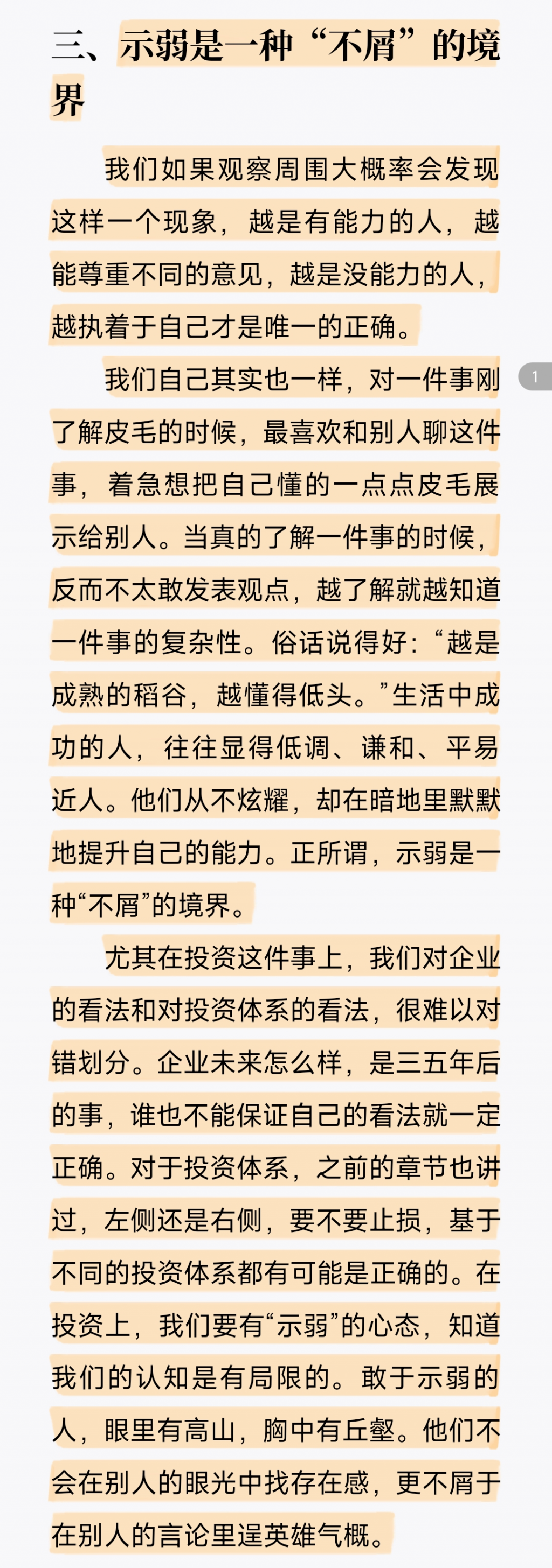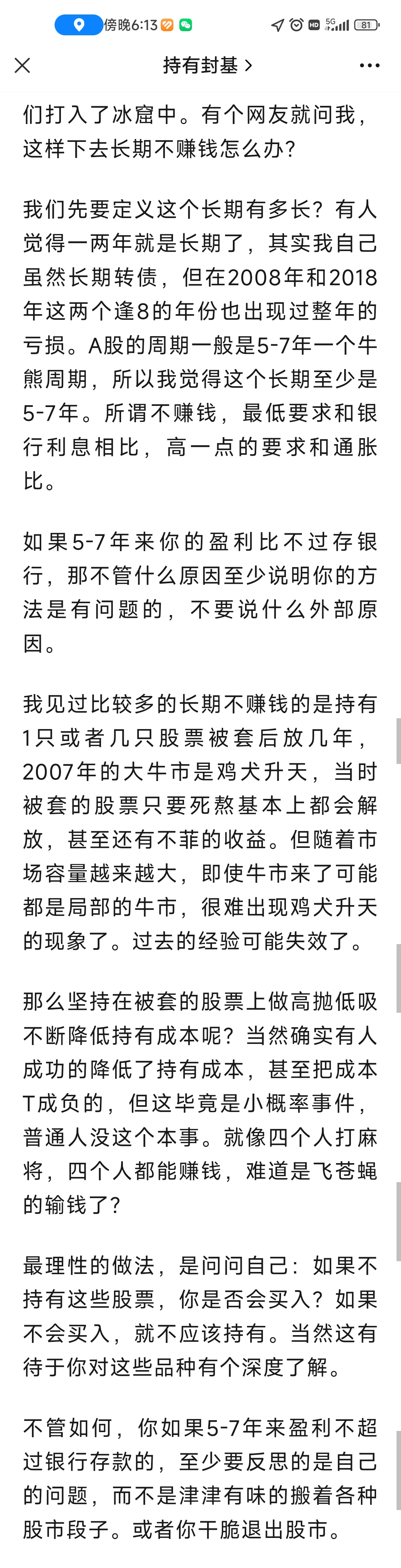 最近一两年晚上频繁起夜,得三五次吧,上厕所(老婆不让拿手机蹲厕所),偷偷(没有跟我老婆说过)拿手机,蹲马桶,观察纳指和a50的实时涨跌,已经形成习惯。但是最近一个月,睡觉前,我严格执行老婆的循循教导,我这次没有跟我老婆打包票说晚上不看手机不蹲厕所,主动按照老婆之前的要求睡觉前把手机放在盒子里,居然治好了我起夜的毛病,现在只有早上六点左右起一次夜上厕所小便,几次三番我想从盒子里把手机拿出来看看盘面,但都忍住了。我希望能坚持下去这个好习惯。天塌不下来。