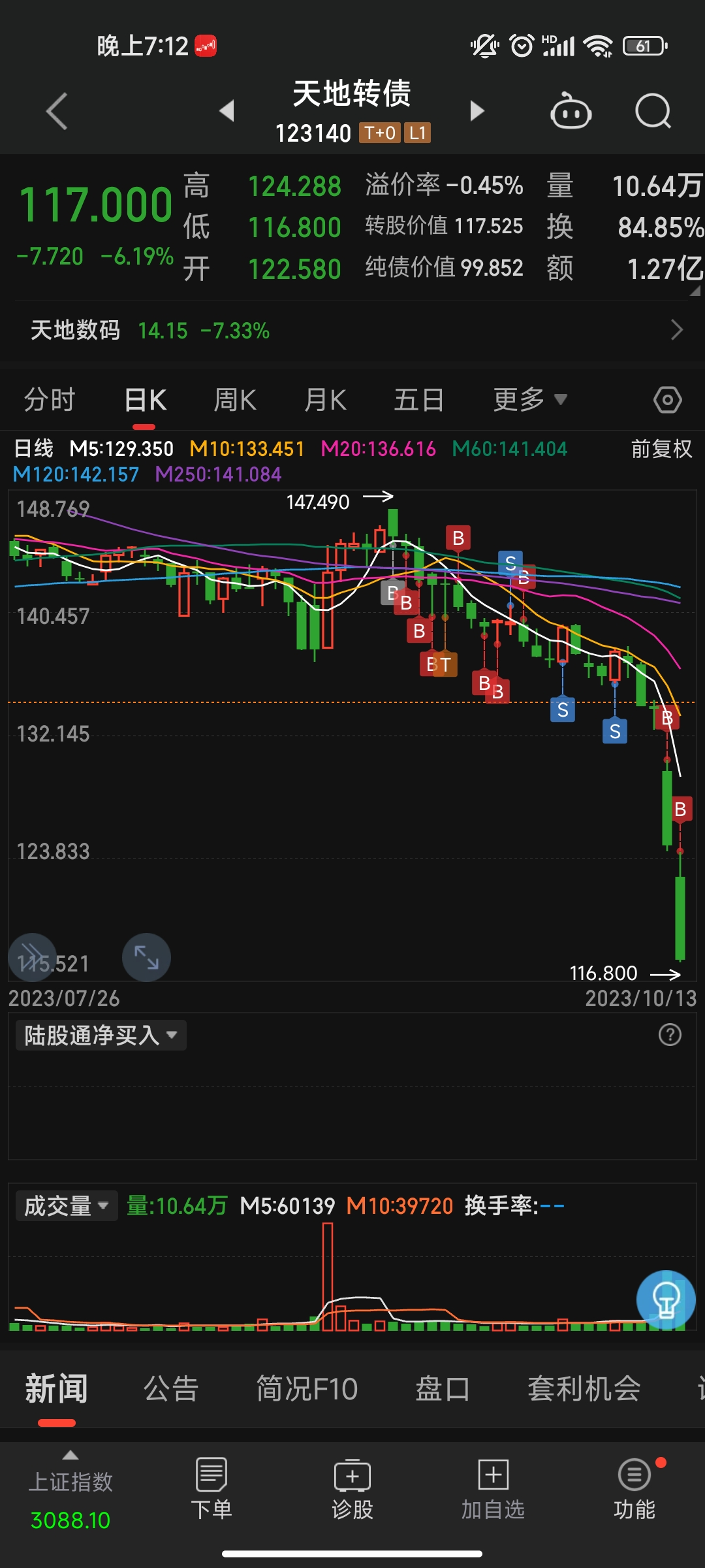 今天真是喜毁了我。我早上跟随大V的建议将所有的条件单都删除了,生怕卖在最低点。但是我又不甘心早上那7%的指数ETF的涨幅,我看到我8月份的亏损一下子就回本了,我没有经受得住诱惑,我在九点半前手动挂了很多卖单。主要是将小市值减仓2/3,ETF减仓1/3,可转债没有太突出的就没有怎么减仓,只把涨停的敖东转债清仓了。合计减仓40%仓位。2023.8月还亏1.2%,争取明后天赚回来。另外,我在8月初说要...我昨天高兴的太早了,仓位减的太多了,我错了,我踏空了整个牛市,我脑子嗡嗡的