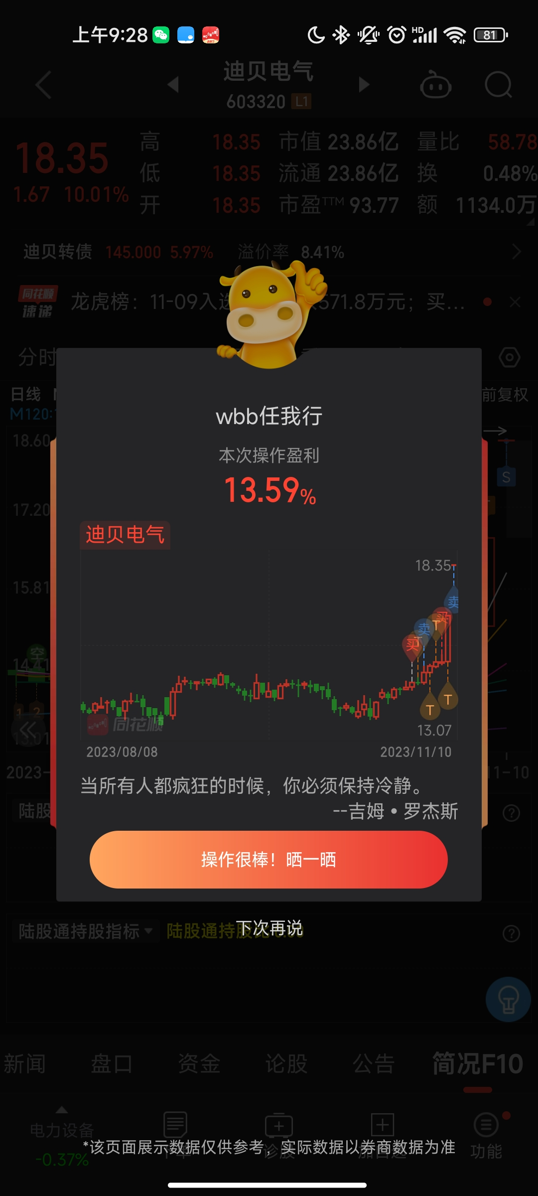 10月份的坑*️终于填上了。我落后群里的小伙伴好几天啊,都怨我这两天挪账户,错过了纳指和a股的大反弹。 感谢迪贝电气,吃到了2个涨停板