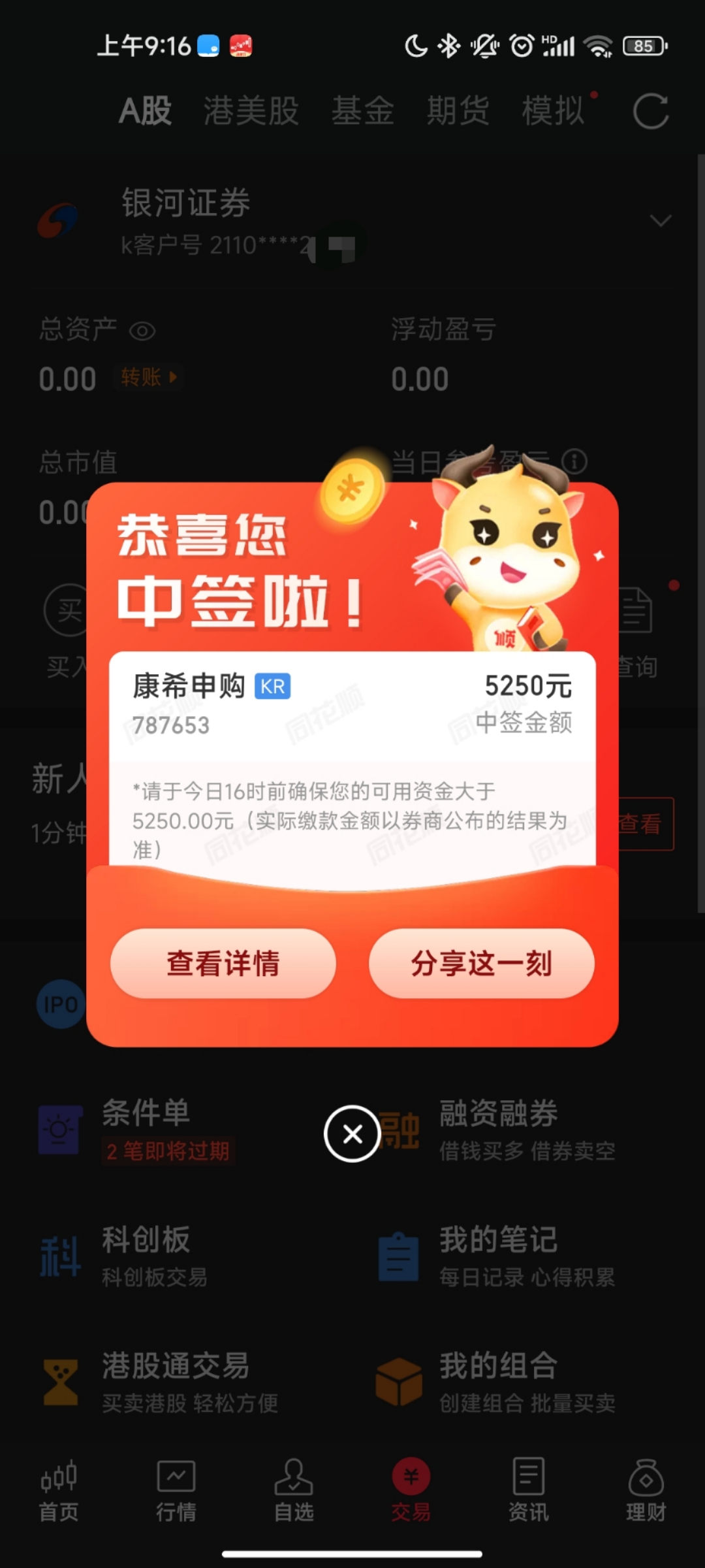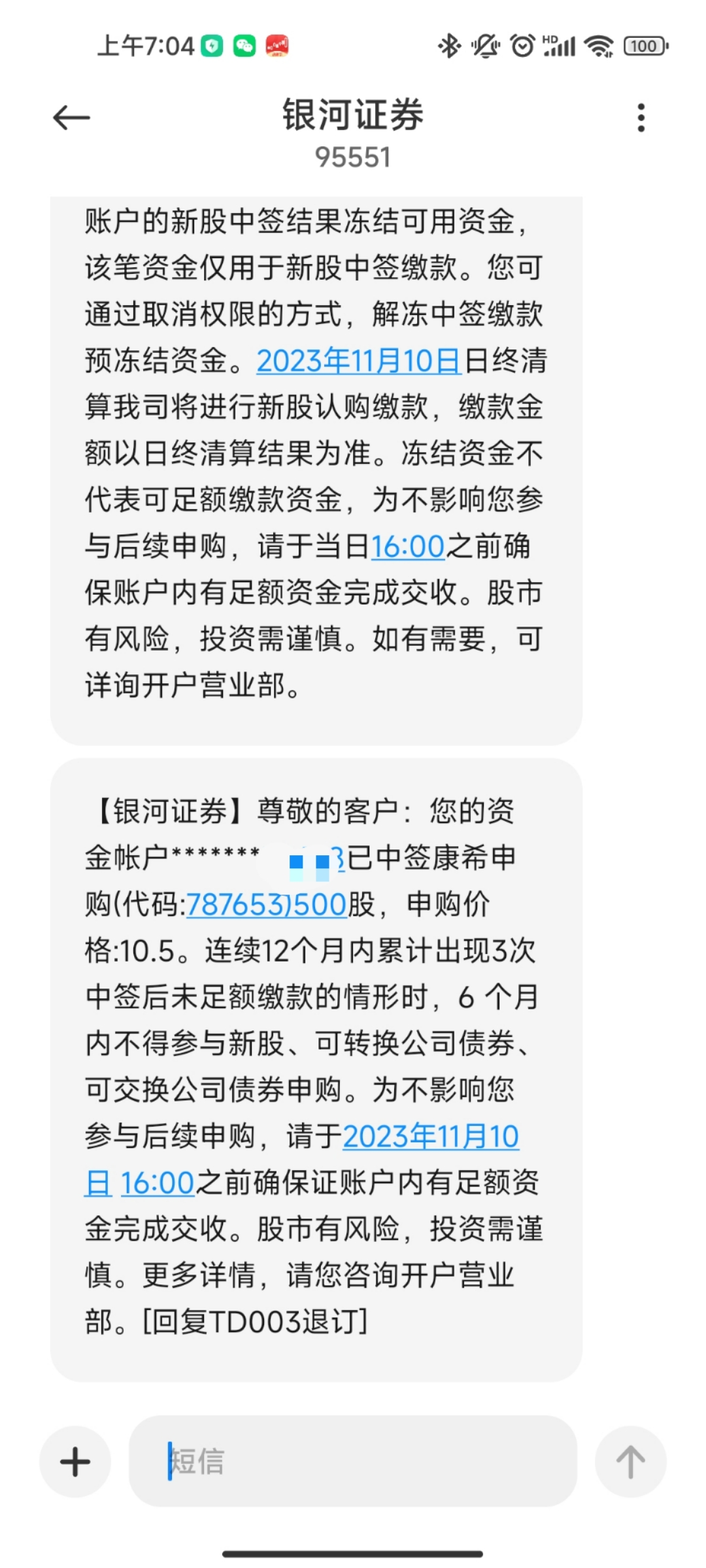 我晕,刚把钱从银河证券挪到华西证券,它就给我来个新股,我TM是第一次中签啊,我要不要缴费康希通信(SH688653)啊?康希通信交款了。