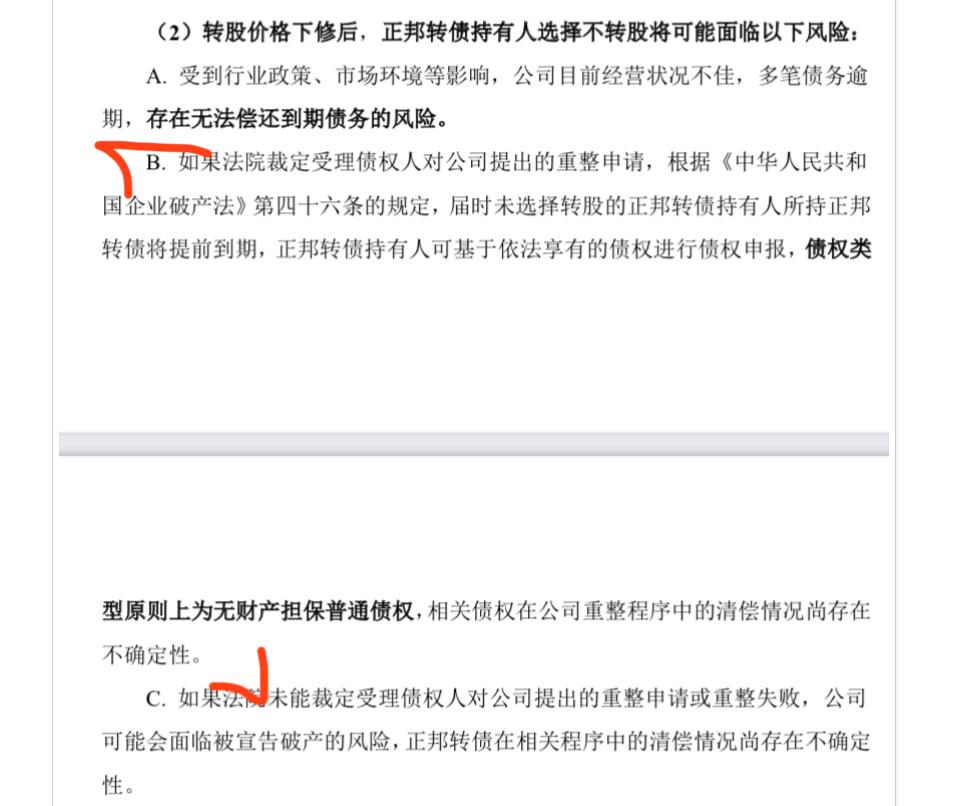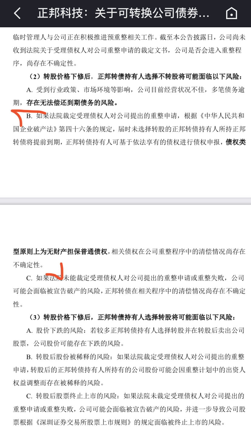 个人愚见,有没有可能是正邦科技公司没仔细研究《深圳证券交易所上市公司自律监管指引第14号一一破产重整等事项》文件内容,风险提示里发了这么一段话,这个话对公司很有利,届时可以促进害怕当债主的持有人尽快转股。公司风险提示这句话很值得商榷,个人觉得这么表述确实与深交所精神有所违背,公司想表达的意思应该是暂停转股,因为重整期间需要固定公司股票总数量,总数量在一定时期内不能有变化,如果变化会影响资产重组的...