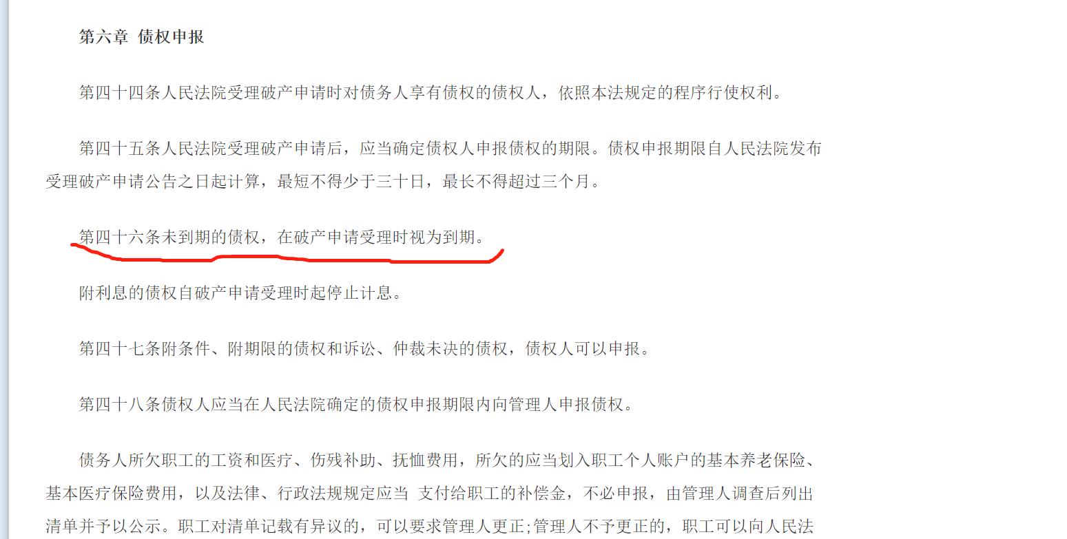 《中华人民共和国企业破产法》第四十六条未到期的债权,在破产申请受理时视为到期。