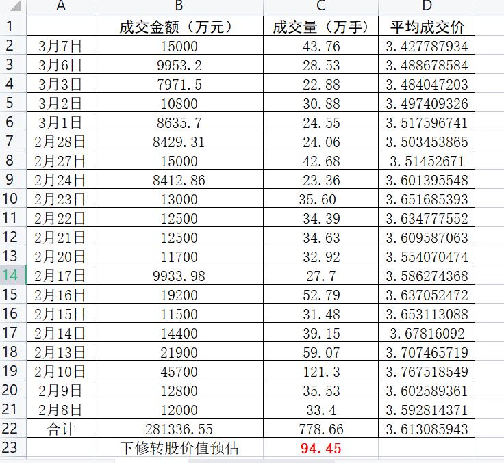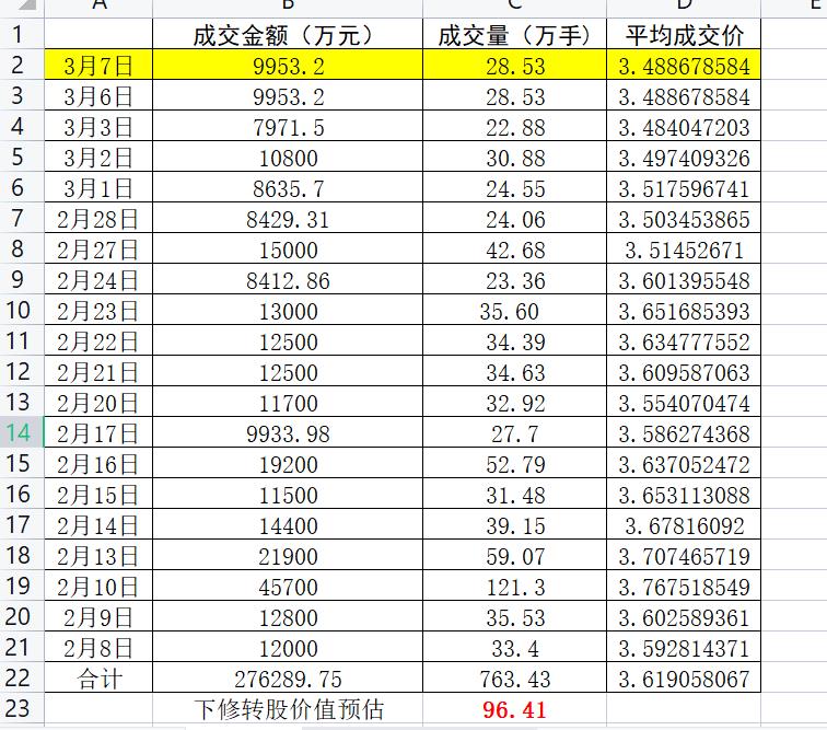 二、距离3月8日股东大会只剩6个交易日,公司股票价格低,当前基本面无重大利空利好预期,未来6个交易日价格波动应该不会太大。下图统计了过去14个交易日每日成交金额和成交量,假如未来6个交易日维持当前3.50左右的价格至3月8日,那下修到底后的转股价值大概在97.77左右;假如接下来继续阴跌至3.40左右,下修到底后的转股价值大概在95.65左右;假如接下来,反弹至3.60左右,下修到底后的转股价值大概在99元以上。