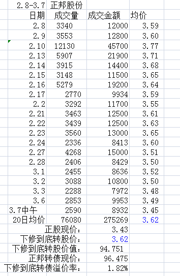 以昨天的收盘价论,转股价下调到底3.6(20天均价),100张10000元面值,可转股10000/3.6=2777.8股,按照收盘价卖出2777.8*3.49=9695元;公司当然想负溢价转股,但是不是他想就能的,不然早就转股了。价格是市场交易产生出来的,所以这个负溢价根本就不大可能出现。哪怕下修前一天可转债价格大跌,一旦公司确定了下修到底,第二天开盘就会迅速拉升到转股价值附近,甚至是正溢价才对。