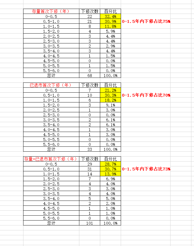 LZ做的很仔细,数据源都给了,结论也没有问题,首次下修的确就是发生在0-1.5年内。