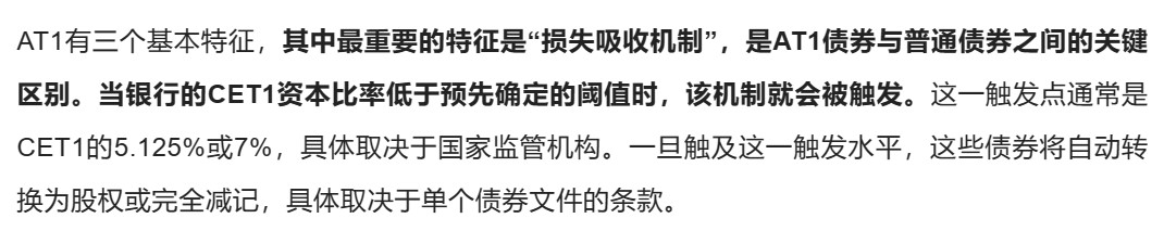 AT1有三个基本特征,其中最重要的特征是“损失吸收机制”,是AT1债券与普通债券之间的关键区别。当银行的CET1资本比率低于预先确定的阈值时,该机制就会被触发。这一触发点通常是CET1的5.125%或7%,具体取决于国家监管机构。一旦触及这一触发水平,这些债券将自动转换为股权或完全减记,具体取决于单个债券文件的条款。